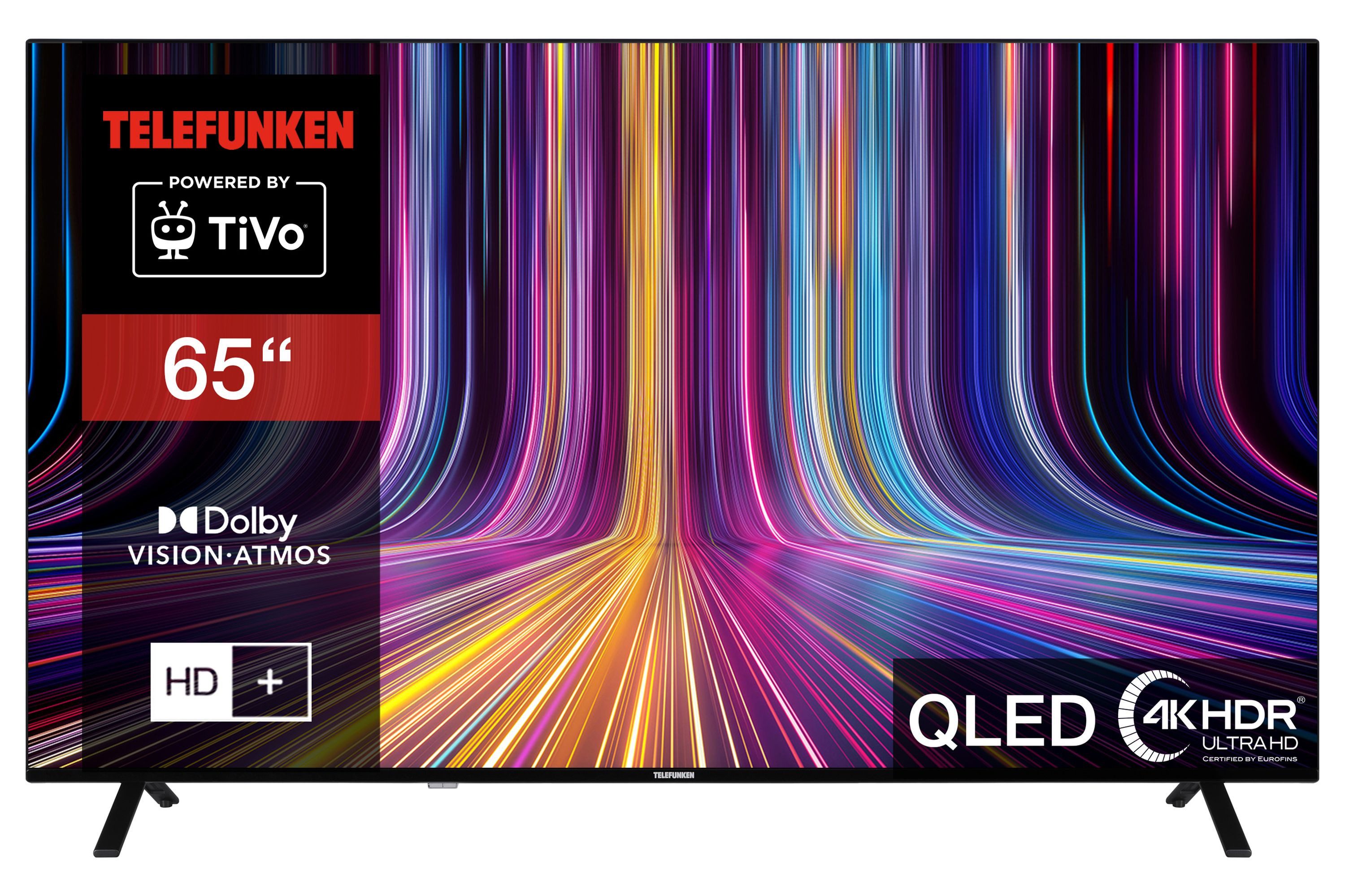 In elegantem Design vereint der QU65TO750S QLED Smart TV von Telefunken alles, was Fernsehen heute zum Erlebnis für Sie und Ihre Familie macht. Das auf eine Bildschirmdiagonale von 164 cm (65 Zoll) dargestellte Bild überzeugt in brillanter 4K UHD Auflösung. Der TV unterstützt außerdem Dolby Vision HDR, Super Resolution und Micro Dimming und liefert damit besonders kontrastreiche Aufnahmen mit einer natürlichen Farbgebung und beeindruckender Detailschärfe. Dank integriertem Triple-Tuner DVB-C/T2/S2 empfangen Sie Fernsehprogramme über Satellit, Kabel oder Antenne direkt auf Ihrem TV, ganz ohne zusätzlichen Receiver. Außerdem sorgen zahlreiche Anschlüsse, wie 3x HDMI (CEC + ARC), 2x USB mit Multimedia Player uvm. für multimediale Flexibilität und Vielfalt. Das TiVo Betriebssystem führt das Smart-TV-Erlebnis in eine neue Ära. Durch seine Vielseitigkeit, Benutzerfreundlichkeit und die umfangreiche Auswahl an Apps wie Netflix, Prime Video, Disney+, YouTube, DAZN und mehr haben Sie die Möglichkeit, Ihren individuellen Smart TV ganz nach Ihren Wünschen zu gestalten.