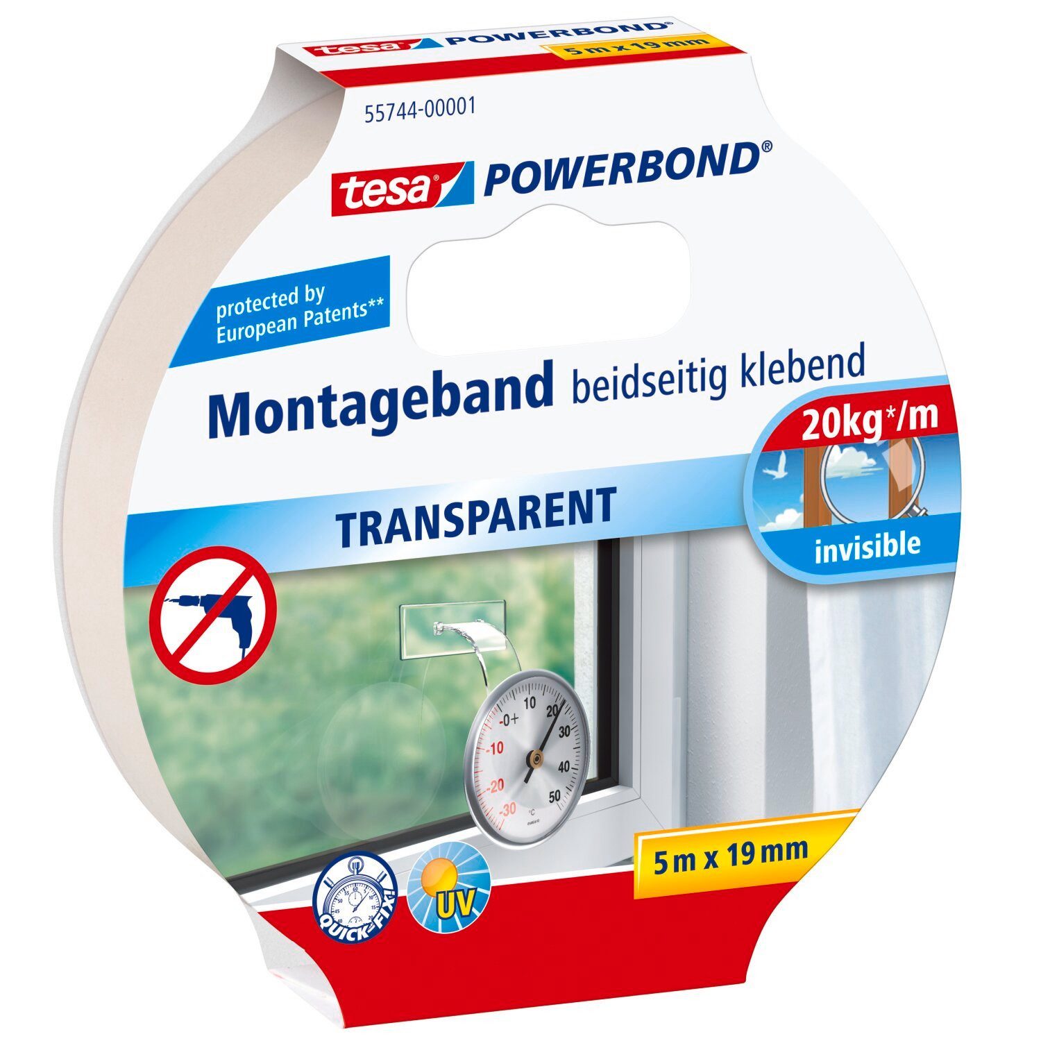Lieferumfang: 1 x tesa Powerbond Montageband Transparent, beidseitig klebend - transparent, 5 m x 19 mm