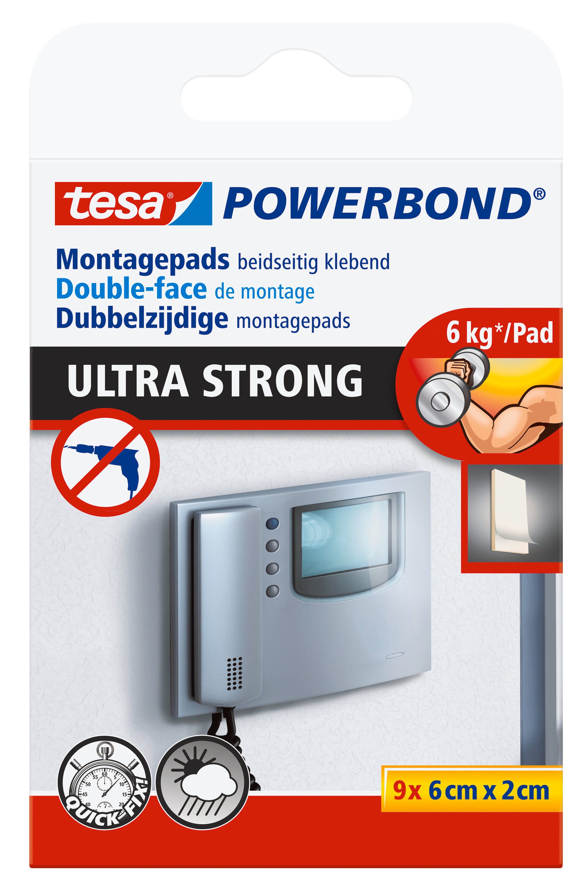 Um schwerere Objekte im Innen- und geschützten Außenbereich zu befestigen, benötigen Sie nicht zwangsläufig Schrauben oder Nägel. Dank der überlegenen tesa®-Klebetechnologie sind auch die Powerbond® Ultra Strong Pads in der Lage, Gegenständen einen zuverlässigen, dauerhaften und sicheren Halt zu geben. Nutzen Sie die hohe Klebeleistung von bis zu 6 kg pro Montagepad für Ihre Projekte und lassen Sie den Bohrer oder Hammer im Schrank, denn: Kleben ist häufig besser als Bohren.
