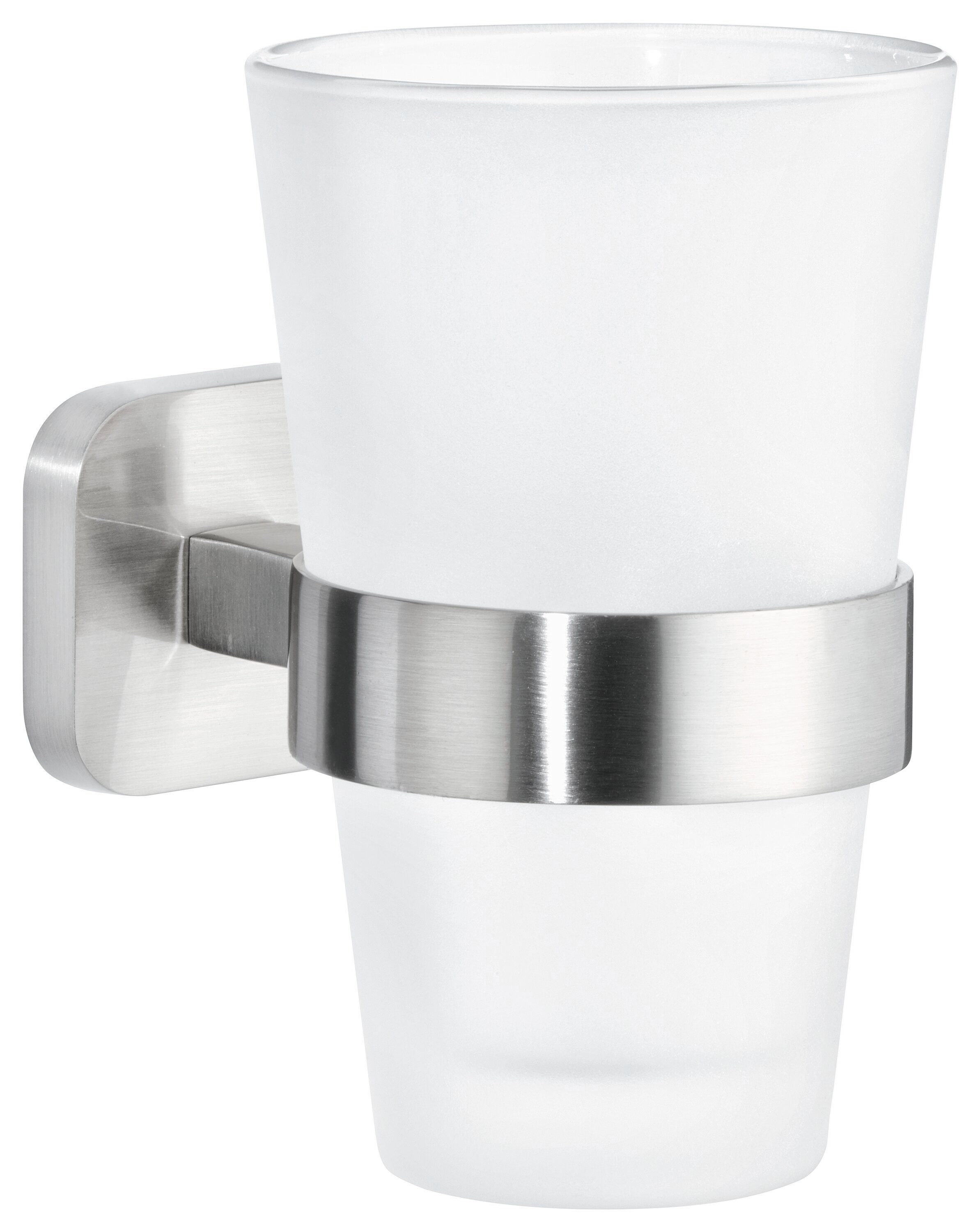 Stilvolles Badaccessoire mit modernem, geometrisch inspiriertem Design: Der kantig geformte Zahnputzbecher aus Milchglas wird von einem verchromten Zahnbecherhalter umschlossen