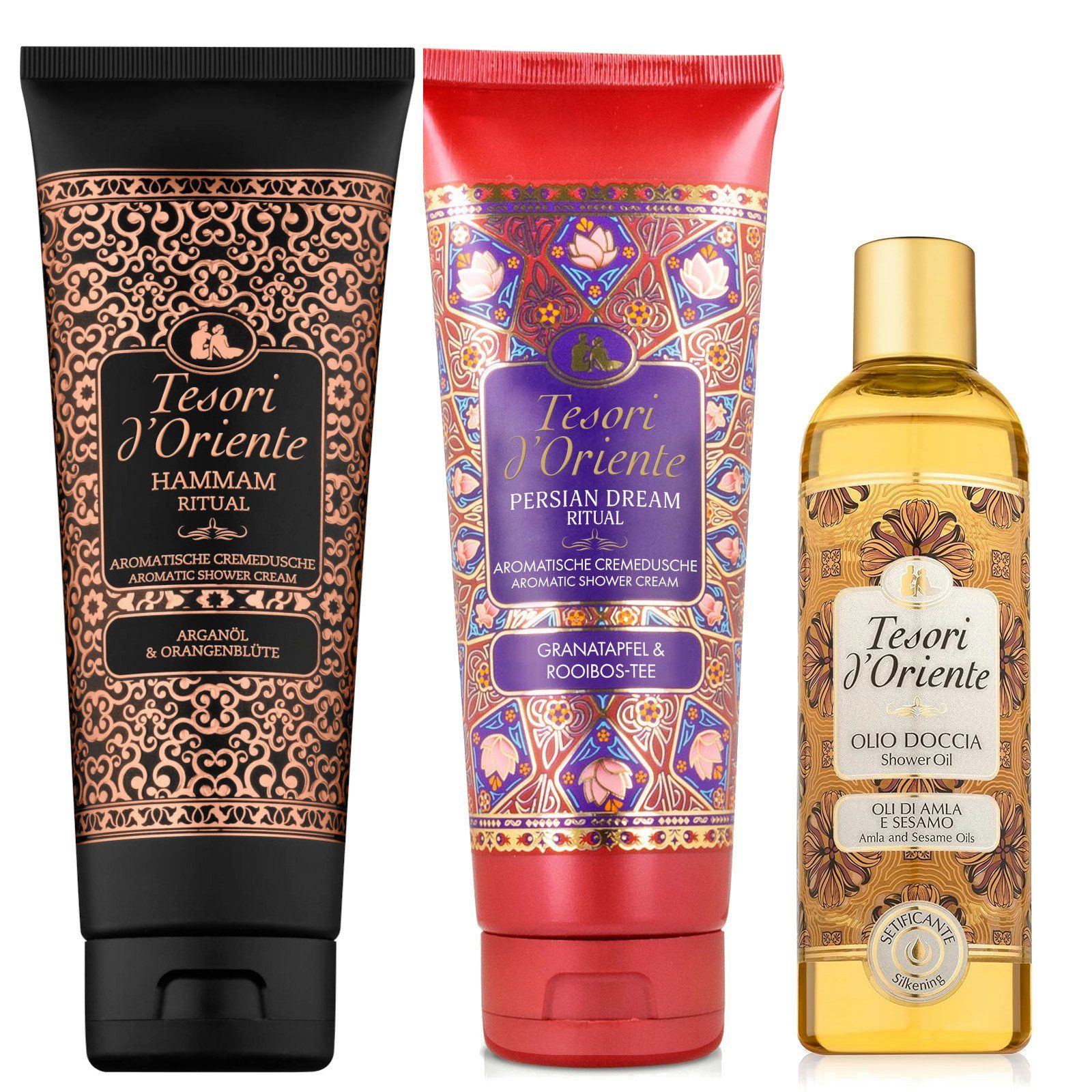 Lieferumfang | Lieferumfang: 1 x TESORI D'ORIENTE Cremedusche Hammam (250 ml) 1 x TESORI D'ORIENTE Cremedusche Persian Dream (250 ml) 1 x TESORI D'ORIENTE Duschöl Amla- & Sesamöl (250 ml) |