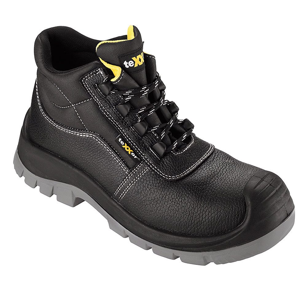 Obermaterial: genarbtes Rindleder (schwarz), graue Nähte, schwarz/weiße Schnürsenkel, gepolsterte Faltlasche (schwarz/gelb) Futter: atmungsaktives Textil-Funktionsfutter (schwarz), atmungsaktives Textil-Laschenfutter (gelb) Sohle: 2-Dichten PU-Sohle (grau/schwarz) mit PU-Überkappe Kappe: metallfrei (Composite Protection) Durchtritthemmung: metallfrei Fußbett: ganzflächige, atmungsaktive Einlegesohle