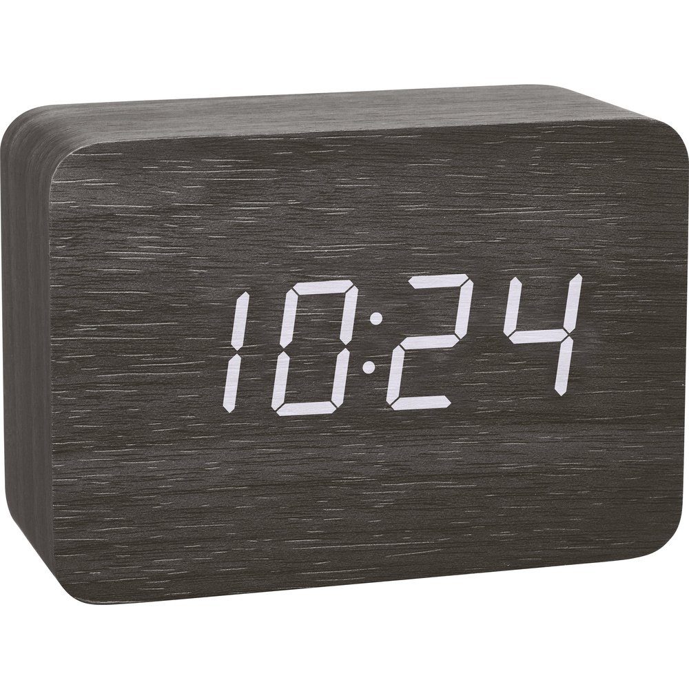 Der Funk-Wecker Clocco ist ein echter Purist. Das minimalistische Design in Holz-Optik mit unsichtbarem Display passt in Wohn- und Schlafzimmer jeder Stilrichtung. Nutzen Sie den mitgelieferten Netzadapter, werden die Ziffern dauerhaft beleuchtet und lassen sich in drei Helligkeitsstufen einstellen. Wählen Sie zwischen Uhrzeit, Datum, Innentemperatur oder einer wechselnden Anzeige aus. Mit der automatischen Dimm-Funktion geht die Beleuchtung zwischen 19 und 6:59 automatisch auf die niedrigste Stufe. Die Nachtruhe bleibt so ungestört und die Uhrzeit ist dennoch ablesbar. Möchten Sie Clocco nur mit Batterien betreiben, bleibt die Anzeige unsichtbar und wird durch ein Geräusch oder eine Berührung kurz aktiviert. Der Weckalarm sorgt für rechtzeitiges Aufstehen und mit dem DCF-Empfang stellt sich die genaue Uhrzeit automatisch ein
