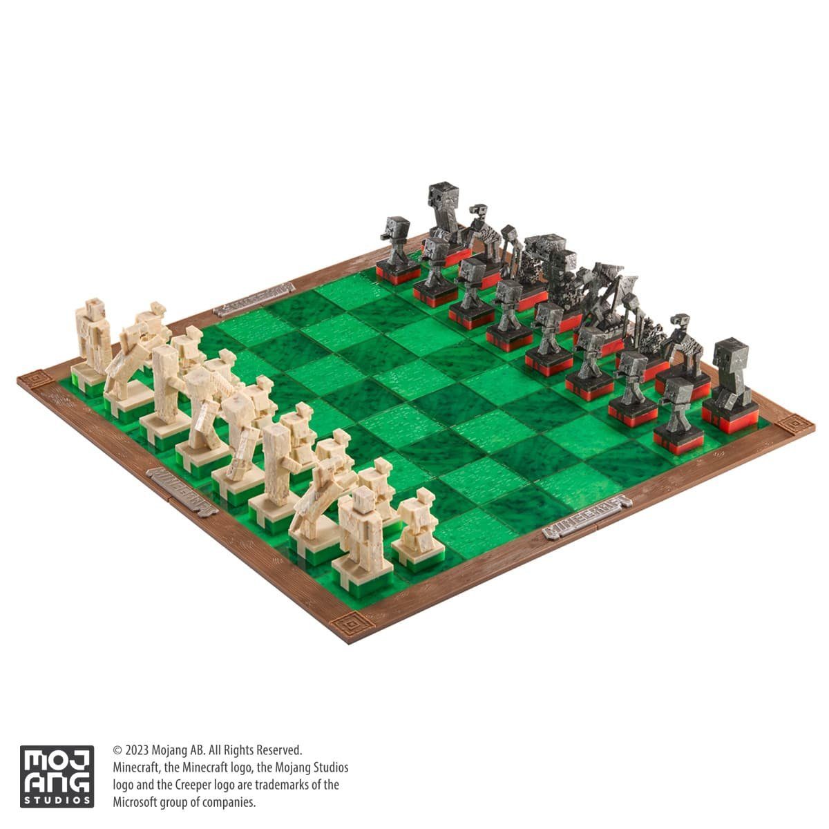 Das quadratische 18-Zoll-Schachbrett verfügt über einen Rahmen um eine Spielfläche aus „Gras“ in strukturierten Grüntönen, umgeben von Minecraft-Logos in Metallic-Optik