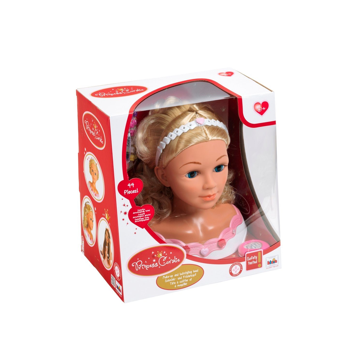 Der Schmink- und Frisierkopf hat wasch- und kämmbares Haar. Zum Lieferumfang gehören ein dermatologisch getestetes Kosmetikset (inkl. Lipgloss, Lidschatten und Rouge), eine Bürste, in die ein Foto eingelegt werden kann, ein Kamm, ein Haarreif, ein Haarperlenset, sieben Haarclips, zwei Barette-Clips sowie 14 Deko-Pins für den Torso, ein Stickerbogen und eine Anleitung mit modischen Stylingtipps.