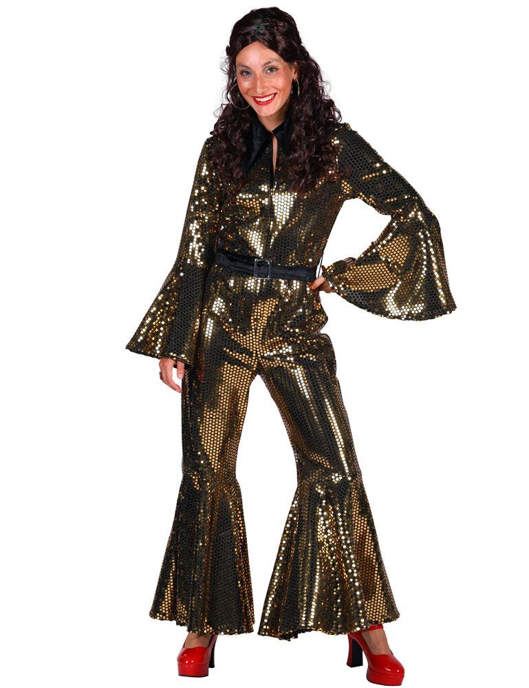 Mit diesem tollen Disco Kostümanzug sind Sie das Highlight auf jeder Kostümparty, bei Show und Theater. Der glamouröse Anzug ist mit vielen goldenen Pailletten besetzt und Sie strahlen damit auf der Tanzfläche der kommenden Faschingsparty oder Mottoparty! Auch, wenn Sie keine Profitänzerin sind - die Scheinwerfer werden trotzdem dauerhaft auf Sie gerichtet sein! Das Disco-Damenkostüm kommt im glitzernden, goldenen Farbton. Die weit ausgestellten Trompetenärmel und die Schlaghose sowie der figurbetonte Schnitt des Karneval Damenkostüms werden die Blicke scharenweise auf sich ziehen - und das nicht nur auf dem Dancefloor! Komplettieren Sie Ihr Retro-Kostüm noch mit passenden Accessoires wie Disco Brillen, Halsketten oder einer 70er oder 80er Perücke und machen Sie die nächste Mottoparty, Karnevalsparty, Kostümparty oder auch ein Festival unsicher mit diesem fantastischen Disco-Kostüm.