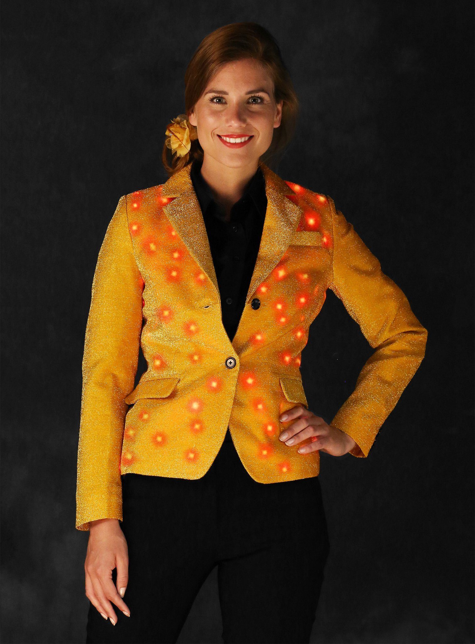 Der helle Wahnsinn – ganz besonders im Dunkeln! Dieses goldene LED Sakko für Damen ist mit seinen zuschaltbaren bunt blinkenden Leuchtdioden ein absoluter Blickfang.