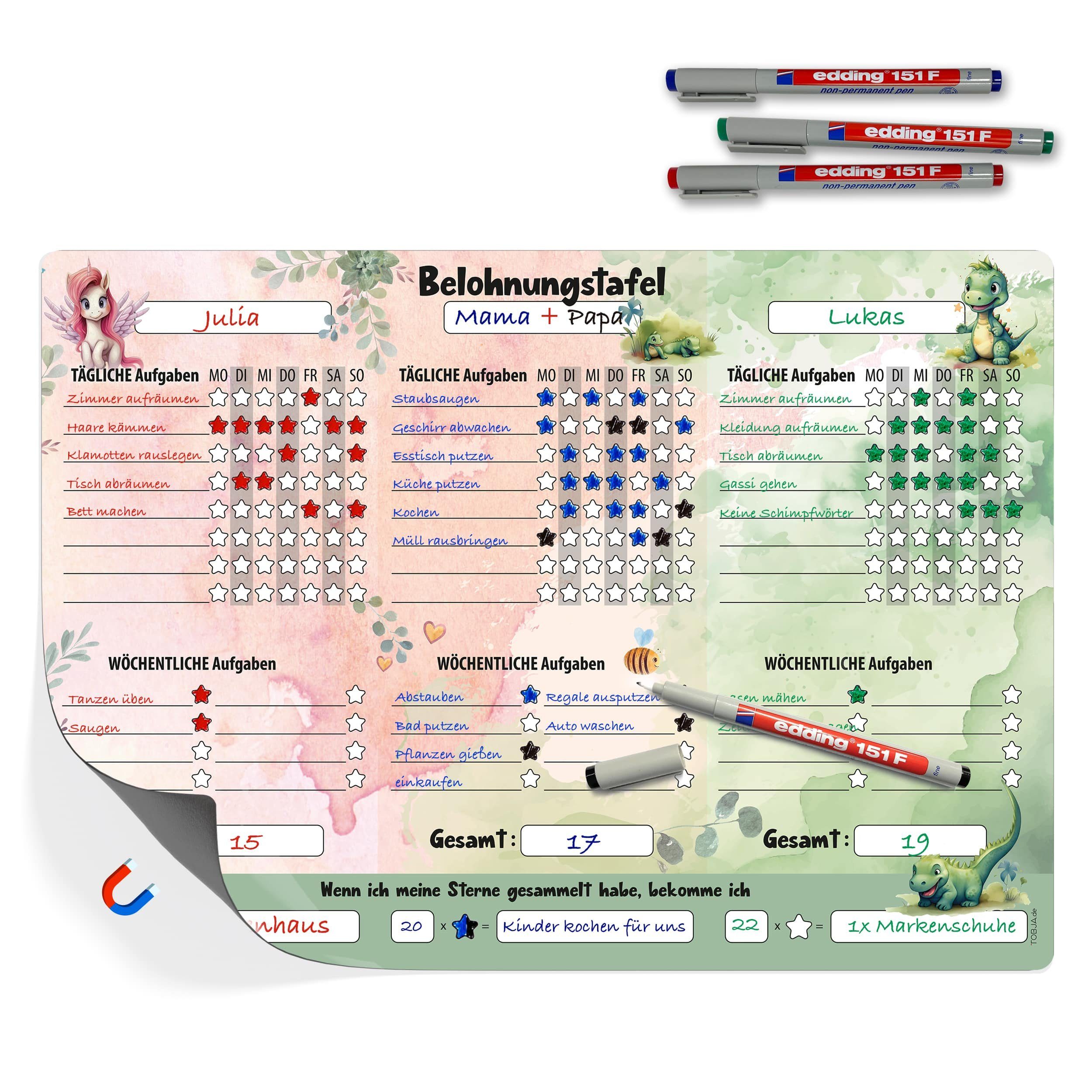 Die Belohnungstafel in DIN A3 ist perfekt für den Kühlschrank oder andere magnetische Flächen geeignet. Mit ihrem ansprechenden Design zieht sie die Aufmerksamkeit deines Kindes auf sich und macht das Erledigen von Aufgaben zu einer spaßigen Aktivität.