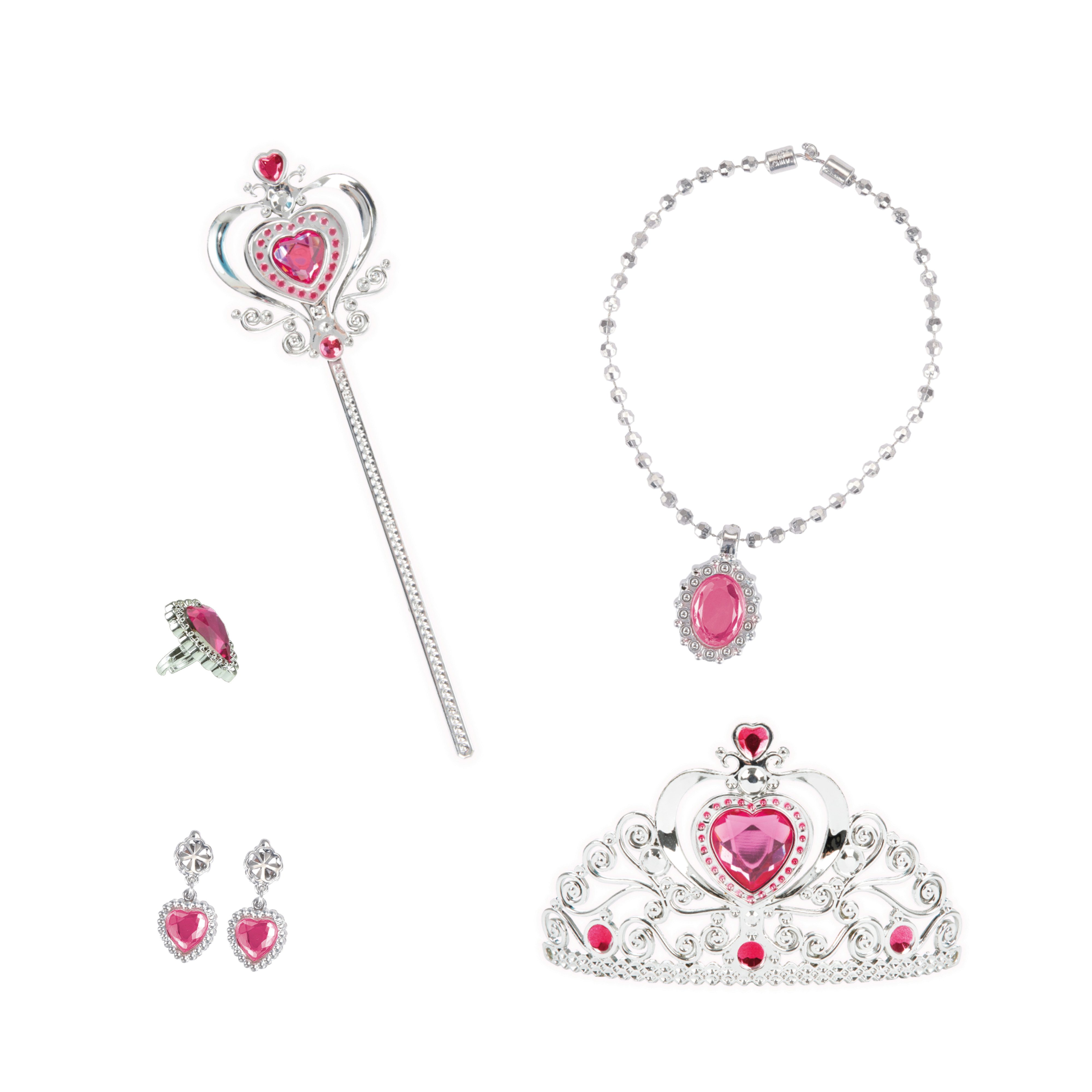 Erschaffe eine Welt voller Glanz und Glamour mit unserem bezaubernden Schmuckset! Dieses magische Set enthält alles, was eine kleine Prinzessin braucht, um sich königlich zu fühlen - eine funkelnde Tiara, einen majestätischen Zauberstab, eine glitzernde Kette, einen königlichen Ring und zwei entzückende Ohrringe.