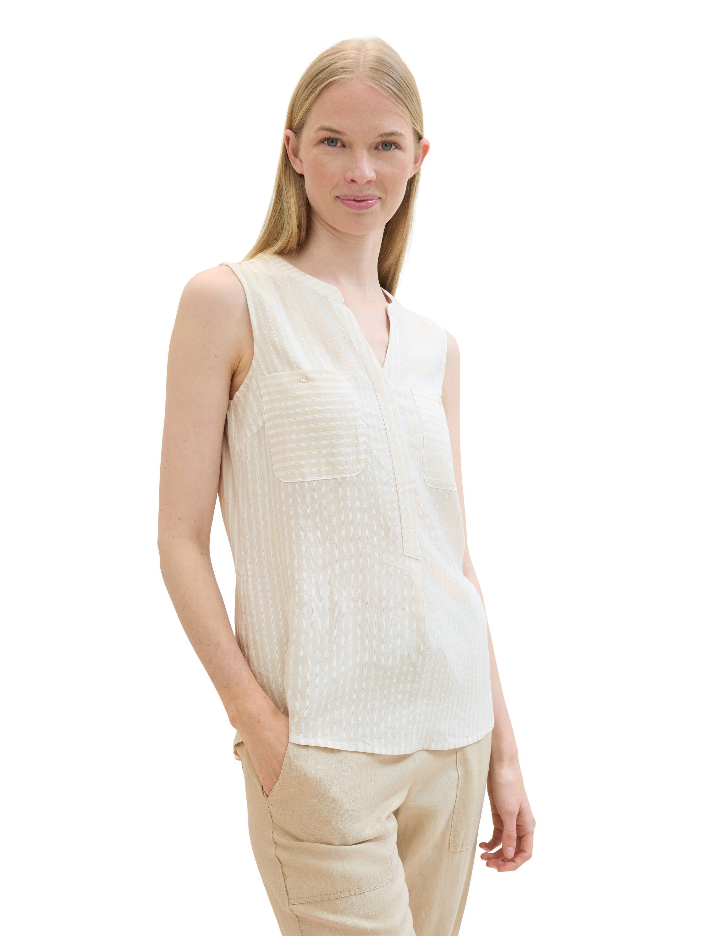 Du möchtest ein Outfit, das hervorsticht? Dann schau dir dieses Blusenshirt von TOM TAILOR genauer an. Denn das schöne Streifenmuster macht auch dezente Looks zu einem sportlich maritimen Outfit. Dieses Shirt hat einen V-Ausschnitt und ist normal.