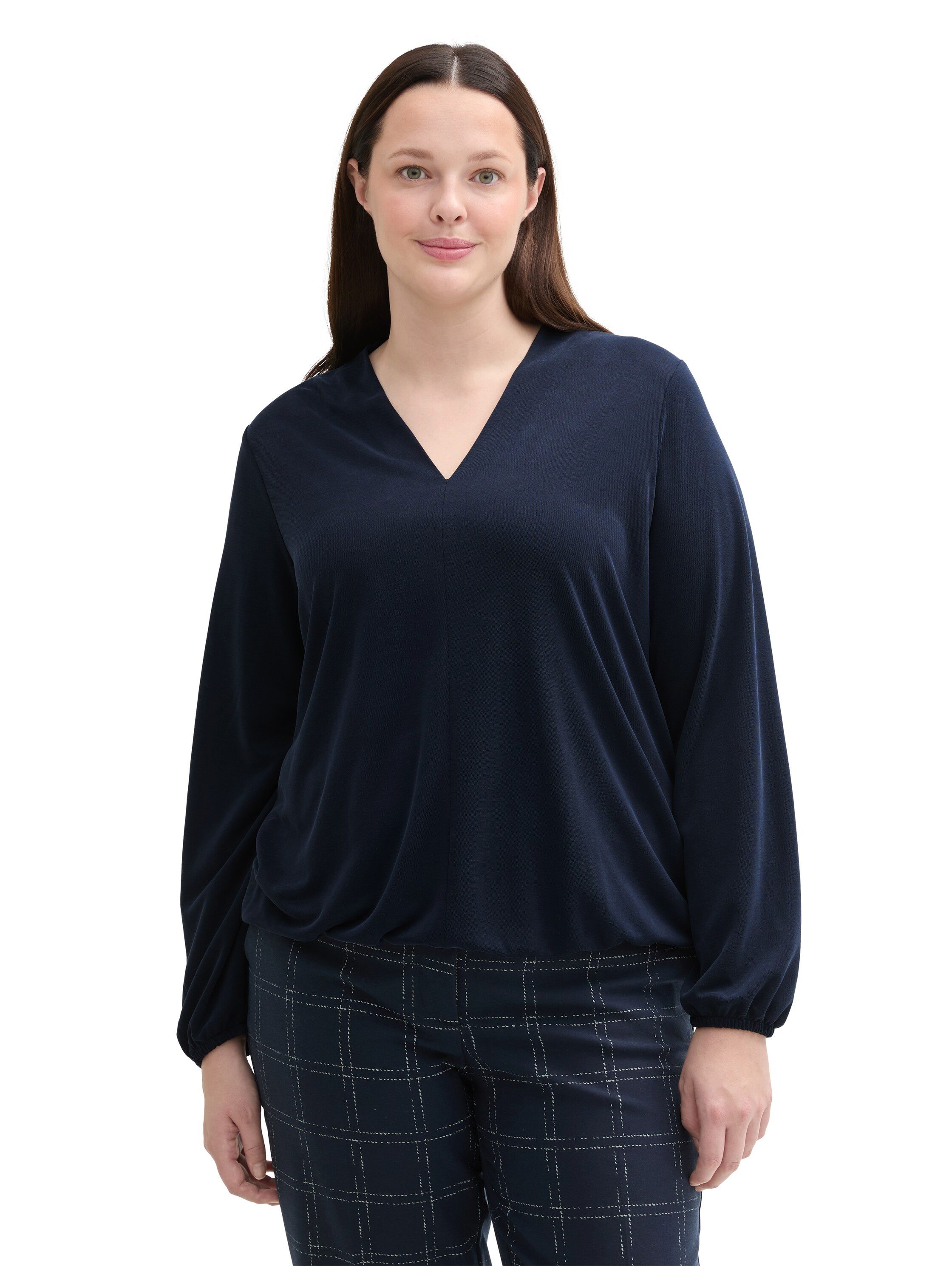 Gesucht und gefunden: Schau dir das Langarmshirt von TOM TAILOR PLUS mal genauer an. Die langen Ärmel enden in einem elastischen Bund. Dieses Shirt hat einen V-Ausschnitt und ist hüftbedeckend sowie locker geschnitten, sodass du dich wohlfühlst.