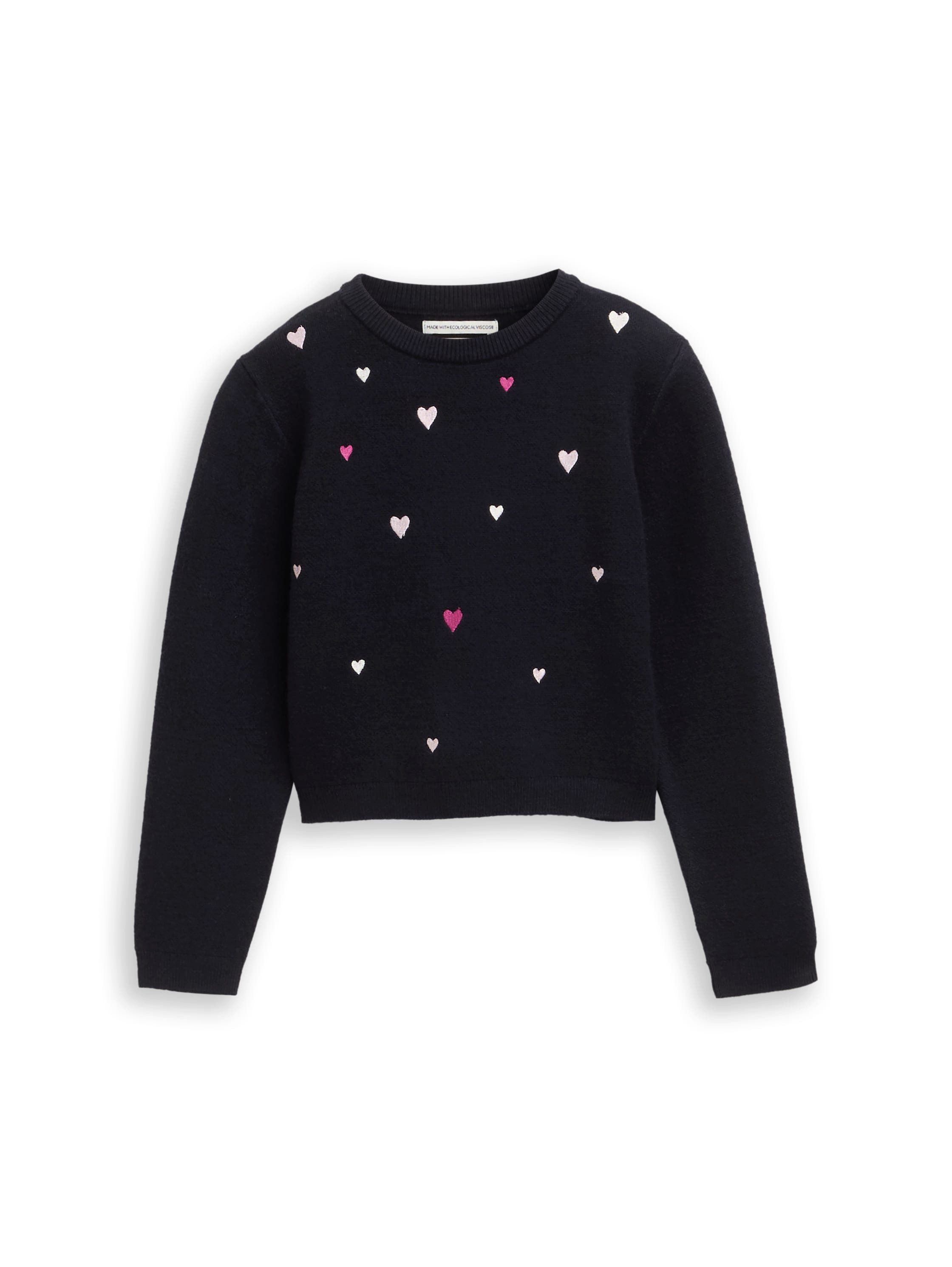 Der Strickpullover zusammen mit Jeans und farbenfrohen Sneakern hält kuschelig warm und schränkt die Bewegungsfreiheit beim Toben auf dem Spielplatz nicht ein. Drunter kann ein Kleid mit Tüllrock getragen werden. Damit sieht das Outfit richtig süß aus.