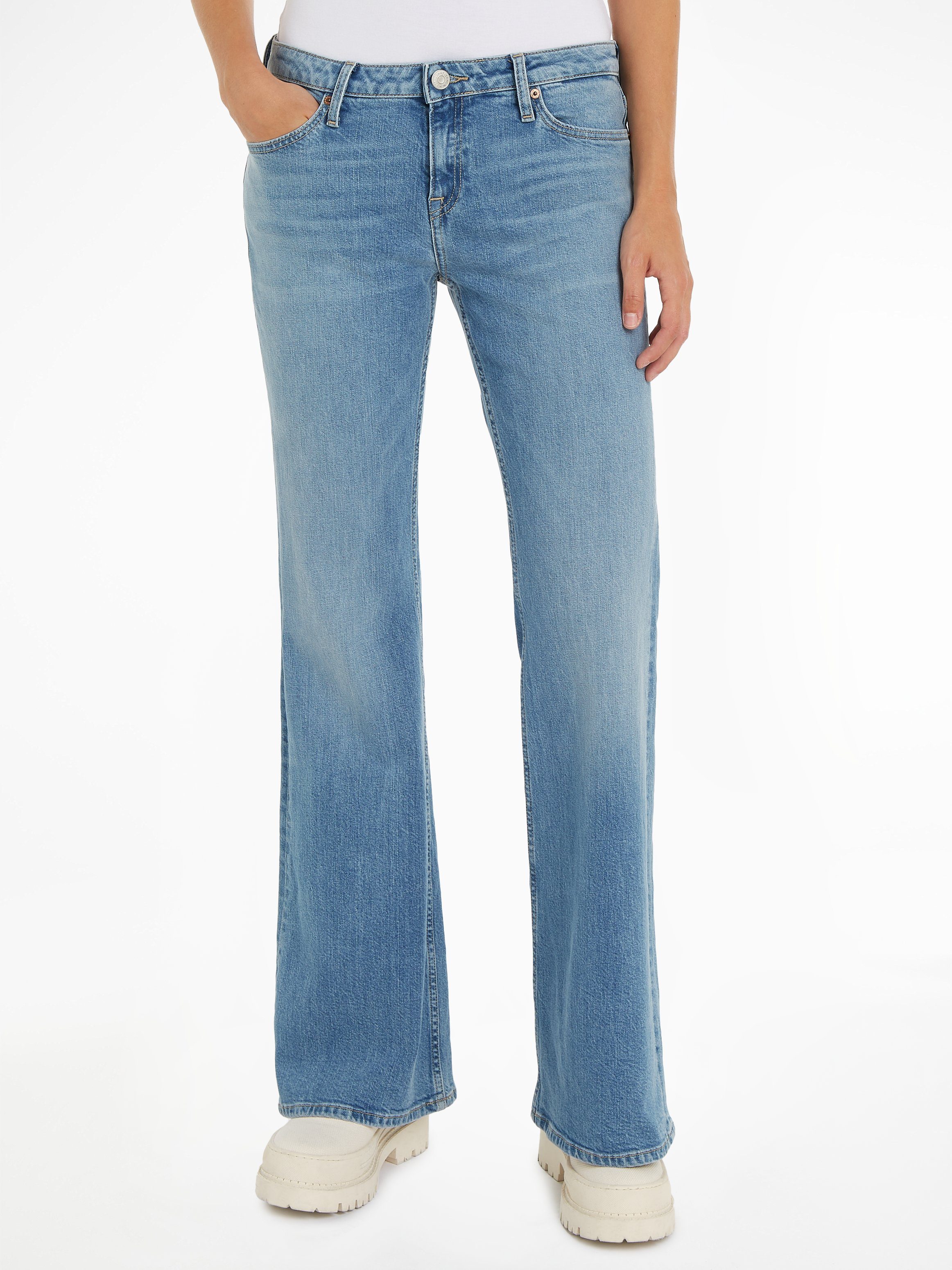 Frische Styles zu kombinieren wird mit der Jeans »Sophie Low Wais Flare Wide« von Tommy Jeans ganz einfach. Die gerade Passform der Jeans ist an den Beinen weiter geschnitten. So haben Schuhe mit hohem Schaft genug Platz. Eine gute Grundlage also für alle, die auf der Suche nach neuen Outfits sind.