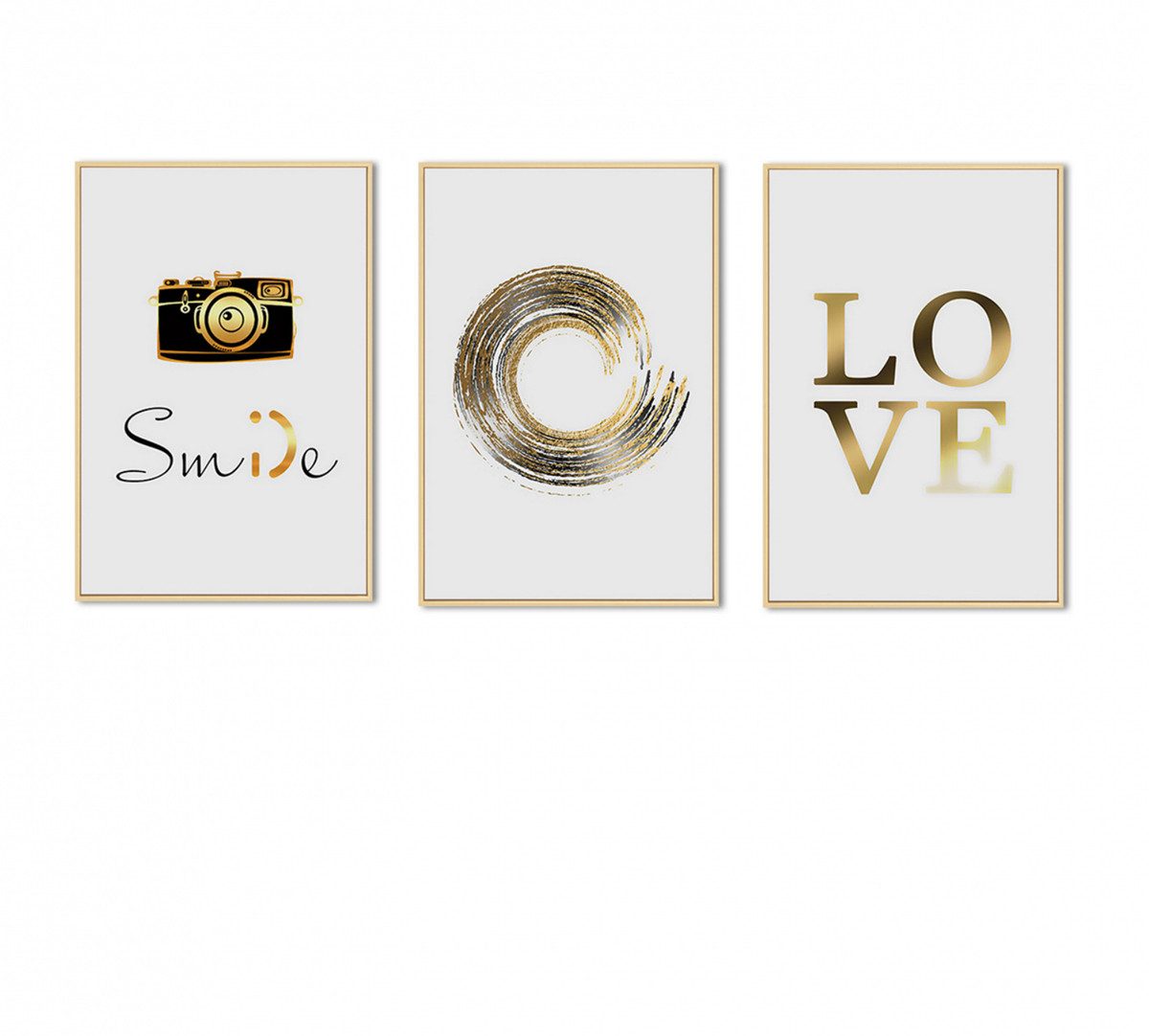 Leinwand Bilder ohne Rahmen von TPFLiving - Poster Leinwand - Smile and Love - Gold auf weißem Hintergrund - 7 verschiedene Größen - 3-er Set