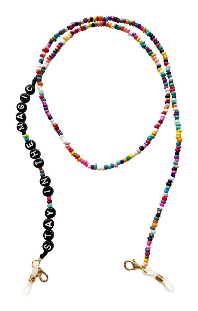 Vorbei sind die Zeiten der vergessenen Brillen oder Mund Nase Bedeckungen. Mit diesen Die tollen Fashion Maskenketten setzen Sie ein modisches Statement und machen aus dem notwendigen Übel ein trendiges und schickes Accessoire. Ob zum sportlichen Style, zum eleganten Abendkleid oder zur schlichten Alltagsgardarobe, die Brillenketten lassen sich zu jedem Outfit kombinieren und werden ganz sicher zum trendigen Hingucker. Die ca. 72 cm lange Kette ist mit fröhlich bunten Perlen und am Ende mit schwarzen flachen Perlen mit weißen Buchstaben designt, die den Schriftzug Stay in the Magic ergeben. Mit den Loops oder mit dem Karabiner kann die Maskenkette wahlweise mit der Brille oder auch mit einer Mund Nase Maske kombiniert getragen werden.