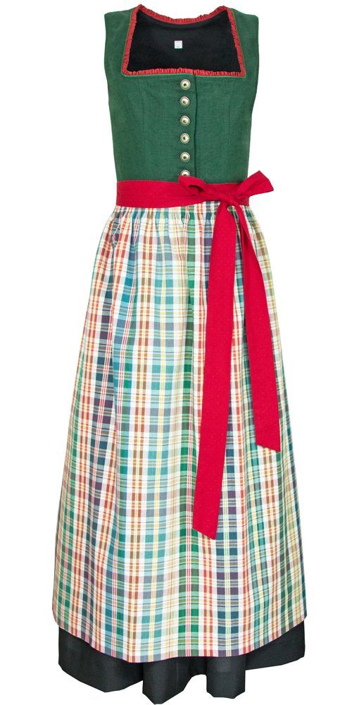 Dieses wunderschöne, lange Damen Dirndl punktet zu Kirchweih, Oktoberfest und traditionellen Festen mit seiner schlichten Eleganz und ist mal eine ganz andere Варианты zu den üblichen, prunkvollen Dirndln. Das Oberteil des Dirndlkleids ist aus dunkelgrünem Leinen und der Ausschnitt wird von einer dezenten, roten Rüsche betont. Geschlossen wird das knöchellange Trachtenkleid im Landhausstil vorne mit silbernen Zierknöpfen mit grünen funkelnden Schmucksteinen. Der lange schwarze Rock ist aus Polyesterstoff und sehr angenehm zu tragen. Aufgelockert wird das Maxidirndl von einer rot, grün, gelb und weiß karierten Schürze mit einem roten Schürzenband. Ein wunderschönes, schlichtes, aber dennoch eleganten Dirndl, dessen Qualität und Design Sie sicher begeistern wird.