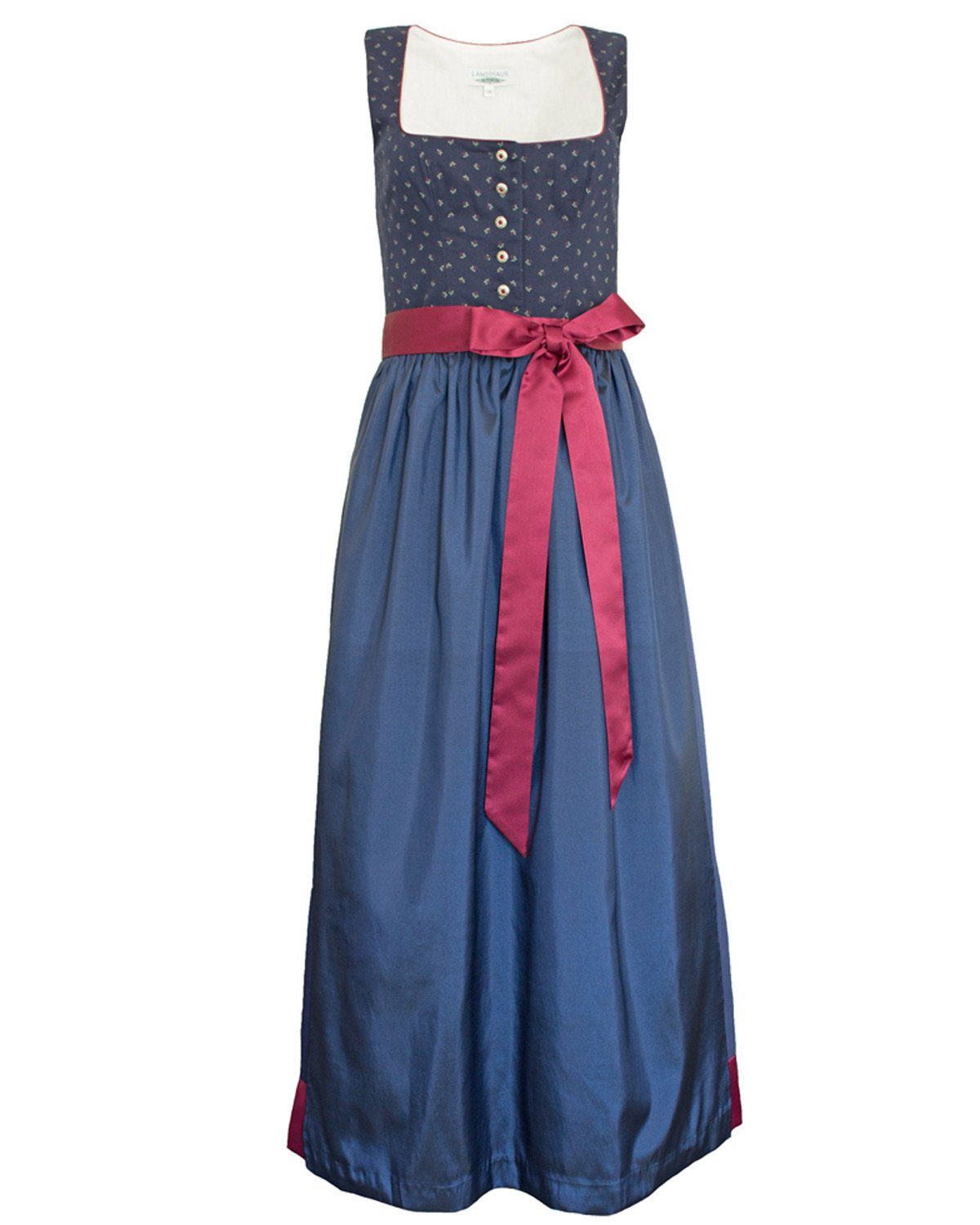 Bei diesem Maxi Dirndl des österreichischen Herstellers Hiebaum müssen Sie besonders vorsichtig sein, wenn Sie damit auf eine Hochzeit gehen. Nicht, dass Sie der Braut die Show stehlen und alle Augen nur auf Sie gerichtet sind! Denn dieses schöne, lange Damendirndl für Frauen aus der Linie 'Landhaus Tracht' passt neben Oktoberfest, Sonntagsausflug oder Kirchweih auch perfekt als Kleid zu besonderen Festlichkeiten. Das Oberteil des Trachtenkleides ist aus einem dunkelblauen Stoff mit feinem Streublümchenmuster gefertigt. Der Ausschnitt wird von einem beerefarbenen Zierband umrahmt. Geschlossen wird das Kleid vorne mit silberfarbenen Halbkugel Knöpfen, welche mit Blumenmuster bedruckt und roten Strass Steinen verziert sind. Der Rock des Damenkleides mit einer 90er Длина ist aus einem gröberen, aber sehr bequemen, marineblauen Stoff gefertigt und der Saum endet in einem satinähnlichen, glänzenden Band in beerefarbenen Ton. Die Schürze des Maxidirndls ist Ton in Ton passend zum Dirndl in einem blauen, leicht glänzenden Stoff, gehalten. Das dunkle pinke Band zum Binden hebt sich besonders schön von der dunklen Schürze ab. Ein wunderschönes und elegantes Dirndl für Damen, Qualität und Design werden Sie ganz sicher begeistern.