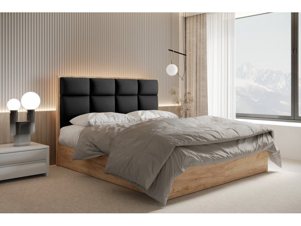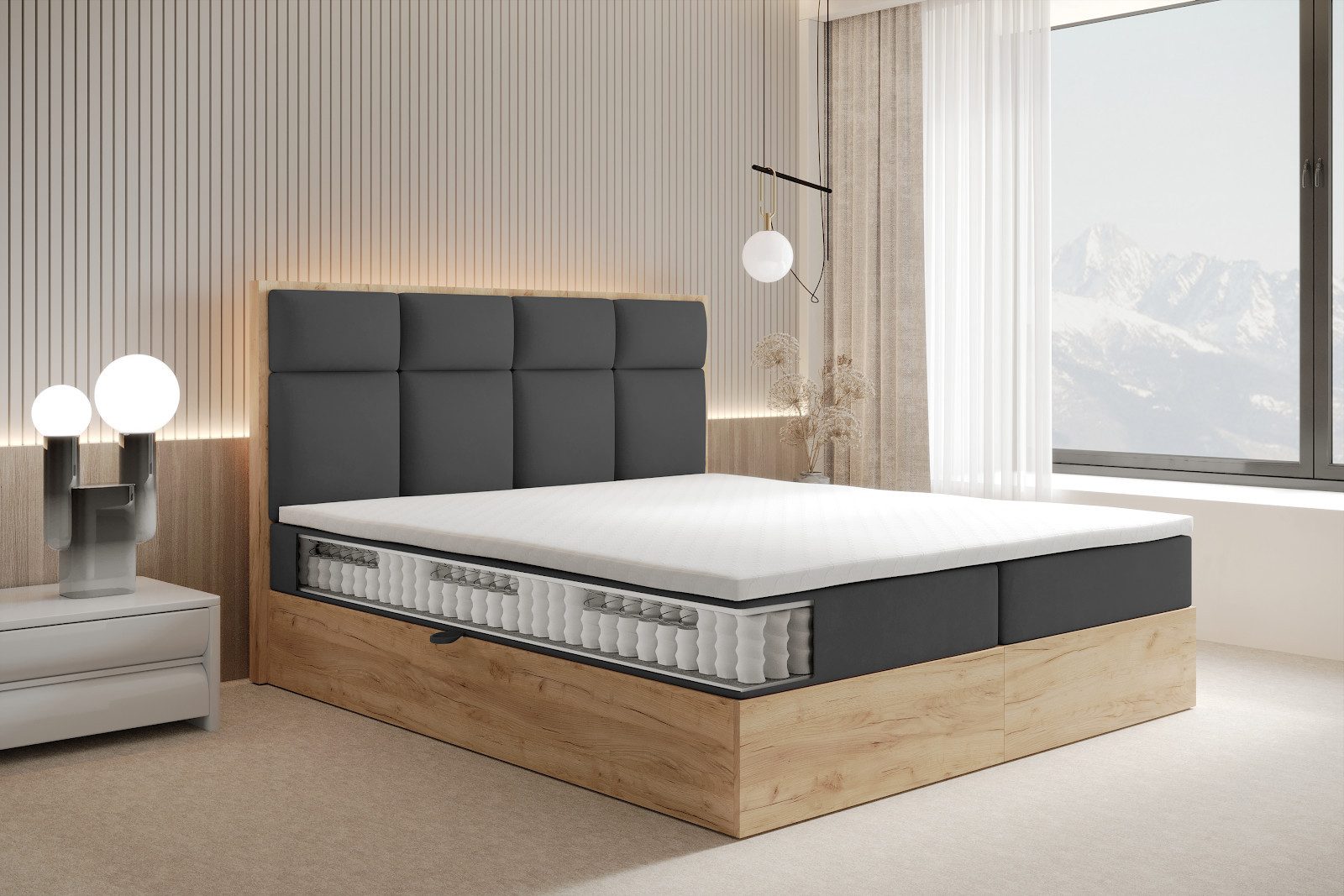 Das kontinentale Bett SELVA kombiniert moderne Funktionalität mit einem eleganten Erscheinungsbild. Die seitlich öffnenden Bettkästen bieten viel Stauraum für Decken, Kissen oder andere Gegenstände und lassen sich dank des Hebemechanismus mühelos bedienen.
