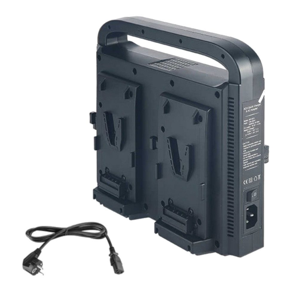 Lieferumfang | 1x V-Mount 4-Kanal-Ladegerät, 1x Ladekabel (Eurostecker) - ohne Akku! |