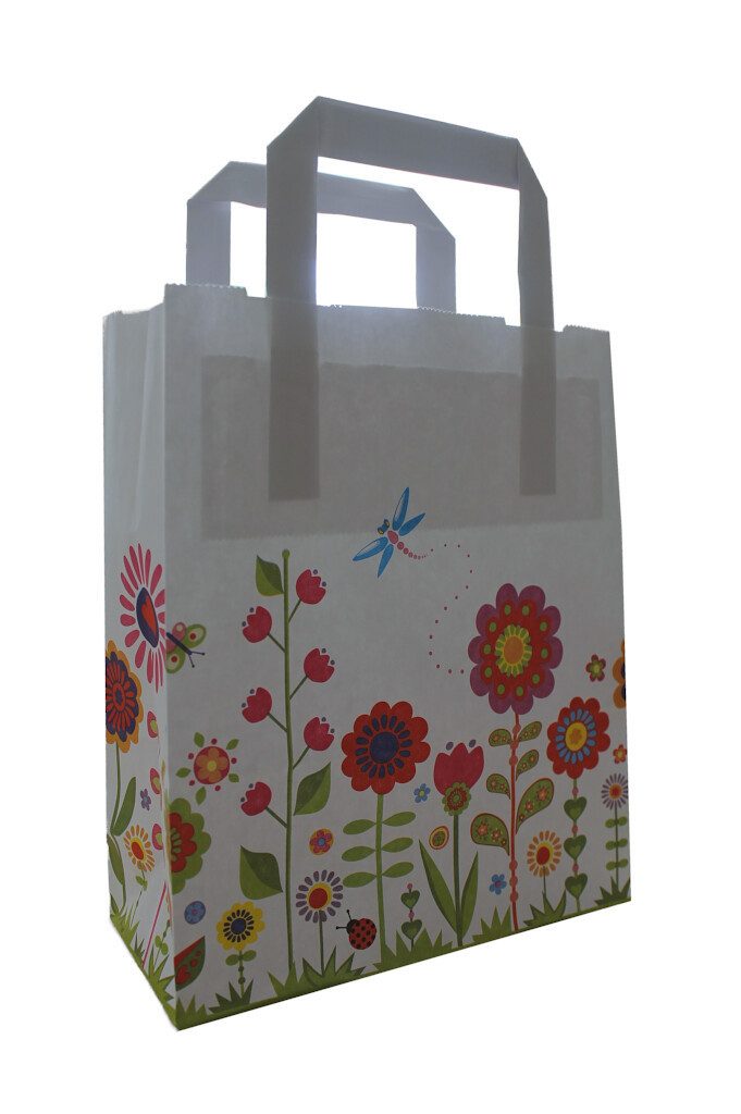 Die Taschen sind mit einem Flachhenkel innen geklebt und das Motiv ist auf weißem Papier gedruckt. Die Tragetaschen sind vielseitig einsetzbar, beispielsweise für Modegeschäfte, Läden, Boutiquen, Verkaufsstände, Privatgebrauch.
