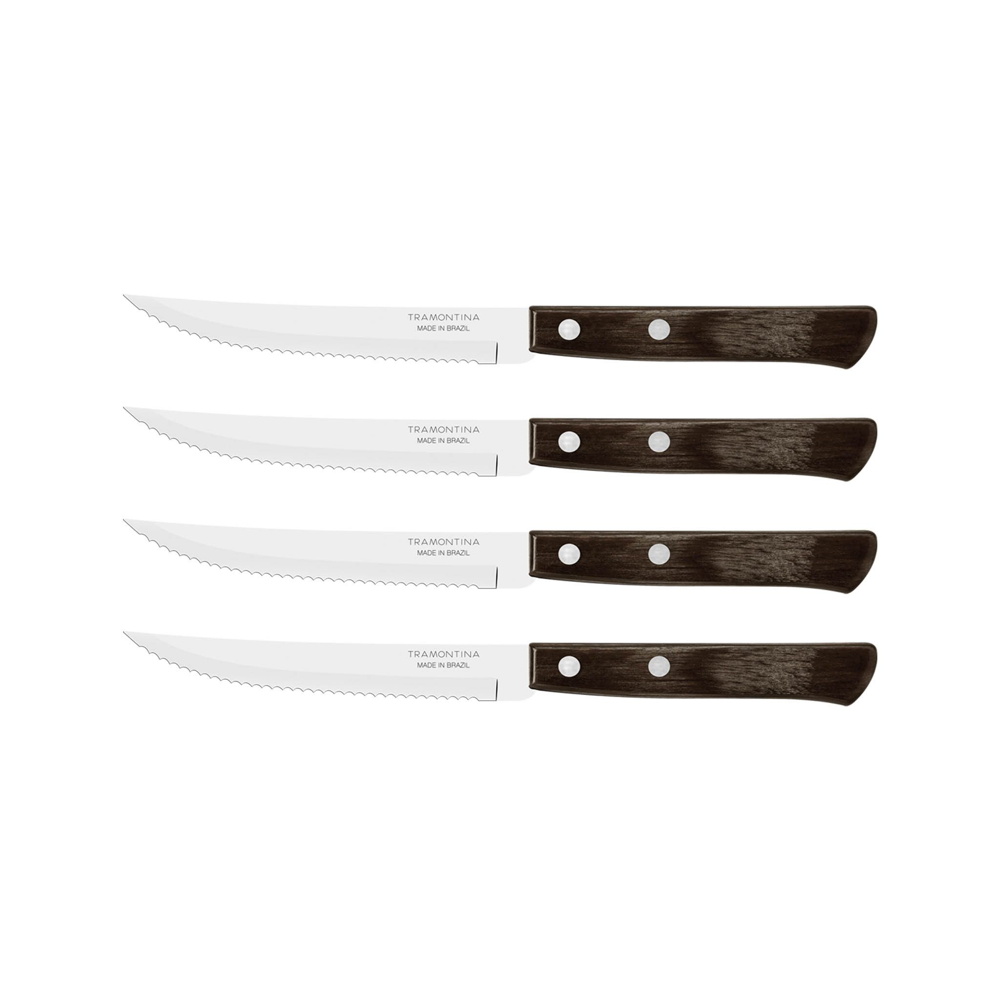 Geht es beim Churrasco ans Verzehren des saftigen Grillguts, ist auf dieses hochwertige, 4-teilige Steakmesser-Set von TRAMONTINA voller Verlass. Denn damit gibt man seinen Gästen bestes Schneidwerkzeug in die Hand: Die Qualität der robusten Steakmesser ist deutlich spürbar, wenn die Klinge aus besonders hartem, rostfreiem Edelstahl sicher und fast wie von selbst durch ein Steak gleitet. Beim Griffmaterial handelt es sich um widerstandfähiges und spülmaschinenfestes Echtholz. Dieses speziell präparierte Holz wird hergestellt, indem mehrere Schichten Kiefernholz mit Harz imprägniert, danach zusammen gepresst, in Form geschnitten und poliert werden. Auch als Pizzamesser bestens geeignet.