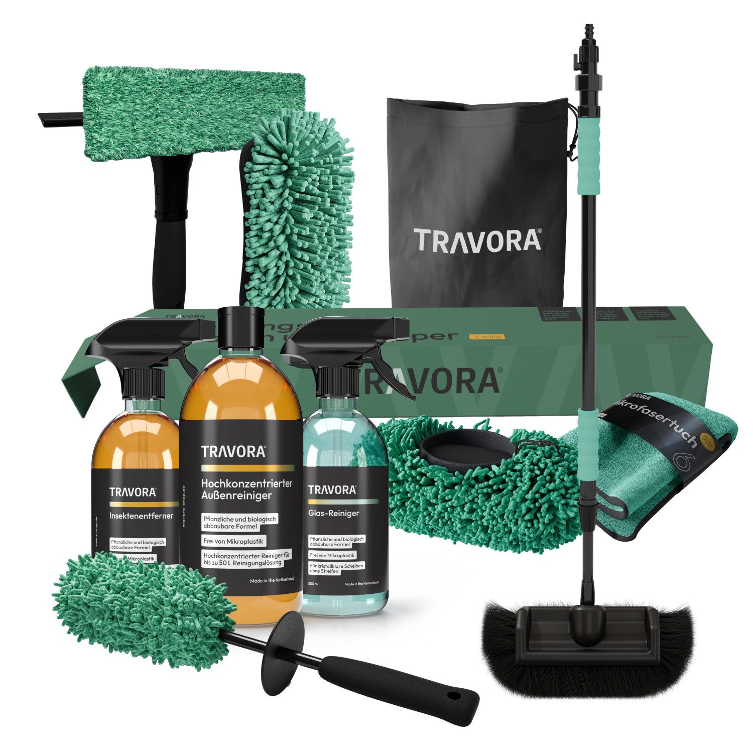Bringe mit dem 7-teiligen Caravan- und Autoreinigungsset von TRAVORA dein Fahrzeug wieder auf Hochglanz. Das Reinigungsset für Auto und Camper beinhaltet alles, was du für die gründliche und materialschonende Außenpflege deines Fahrzeugs benötigst.