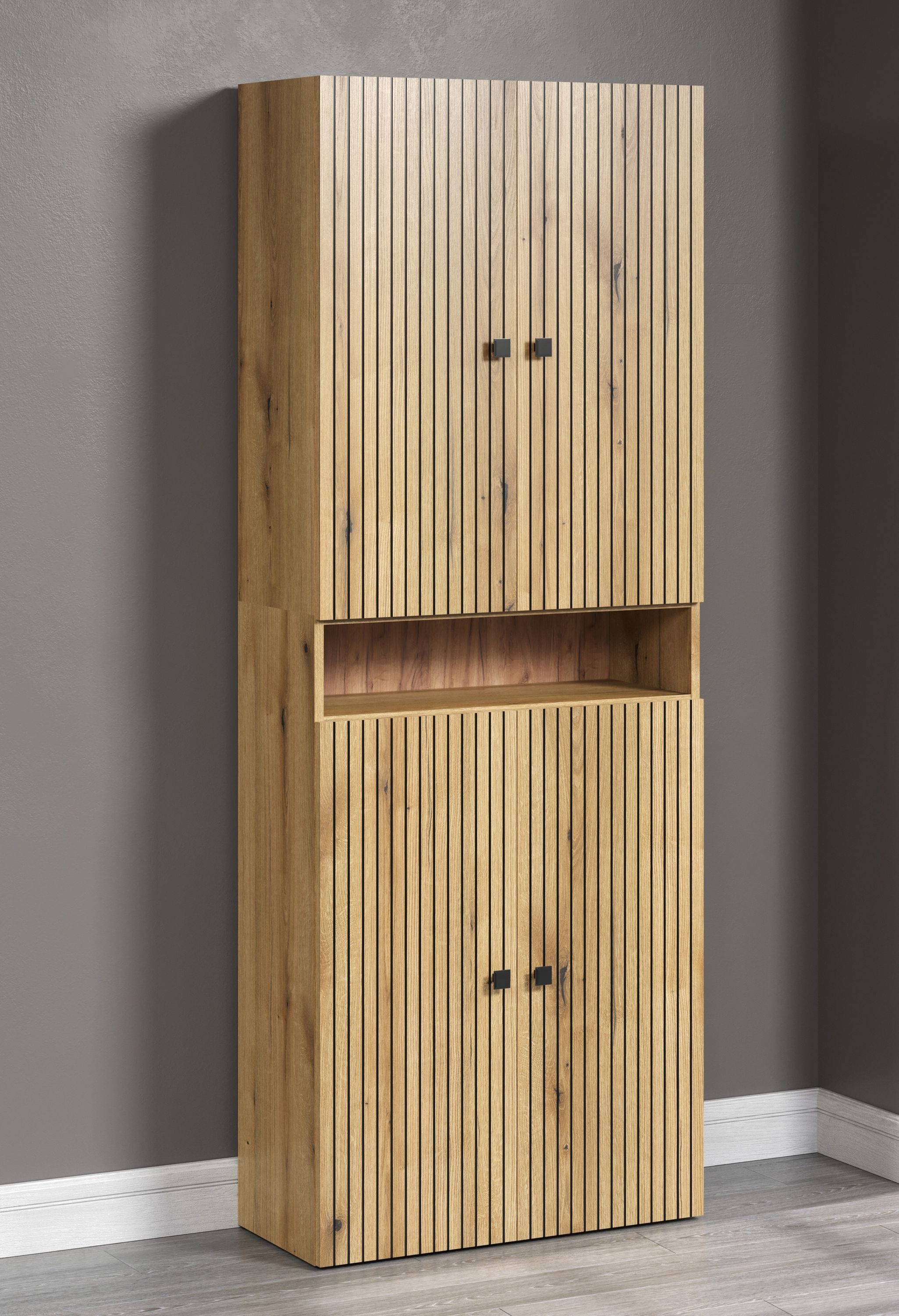 Der Hochschrank im modernen Design ist eine perfekte Ergänzung für Ihr Badezimmer oder jeden anderen Raum, in dem Sie zusätzlichen Stauraum benötigen. Mit den Maßen von 70 x 188 x 31 cm bietet er ausreichend Platz für Ihre Utensilien und sorgt gleichzeitig für eine ansprechende Optik. Die Kombination aus hochwertigem Holzwerkstoff und einer melaminbeschichteten Oberfläche in der Farbton Evoke Eiche unterstützt nicht nur die Funktionalität, sondern verleiht Ihrem Raum auch einen eleganten, natürlichen Look. Die schwarzen Rillen auf den Türfronten setzen einen stilvollen Akzent und harmonieren hervorragend mit den schwarzen Metallgriffen und den Füßen aus Kunststoff. Dank der Nassraumgeeignetheit ist dieser Hochschrank auch ideal für feuchte Umgebungen, während die robuste Bauweise Langlebigkeit garantiert. Der Hochschrank verfügt über zahlreiche Ablageflächen, mit insgesamt vier Einlegeböden und zwei Konstruktionsböden, die für zusätzliche Flexibilität und Anpassungsmöglichkeiten sorgen.