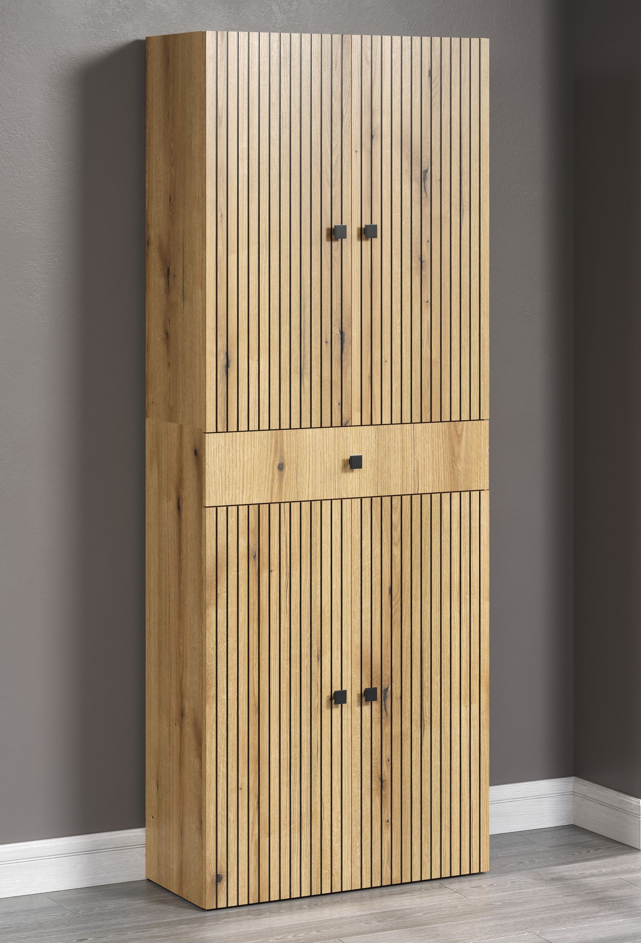 Entdecken Sie den stilvollen Hochschrank mit den Abmessungen 70 x 188 x 31 cm, der nicht nur durch sein ansprechendes Design besticht, sondern auch zahlreiche funktionale Vorteile bietet. Die Kombination aus Evoke Eiche Melamin in Korpus und Front sorgt für eine harmonische und moderne Optik, während schwarze Rillen auf den Türfronten dem Möbelstück eine elegante Note verleihen. Ideal für den Einsatz im Nassraum, bietet dieser Hochschrank genügend Stauraum mit vier modernen Türen und einem praktischen Schubkasten. Der Hochschrank ist nicht nur ästhetisch ansprechend, sondern auch durch seine hochwertigen Materialien langlebig und pflegeleicht. Die schwarze Griff- und Fußfarbe aus Metall und Kunststoff rundet das Gesamtkonzept ab und fügt sich nahtlos in Ihr Zuhause ein.