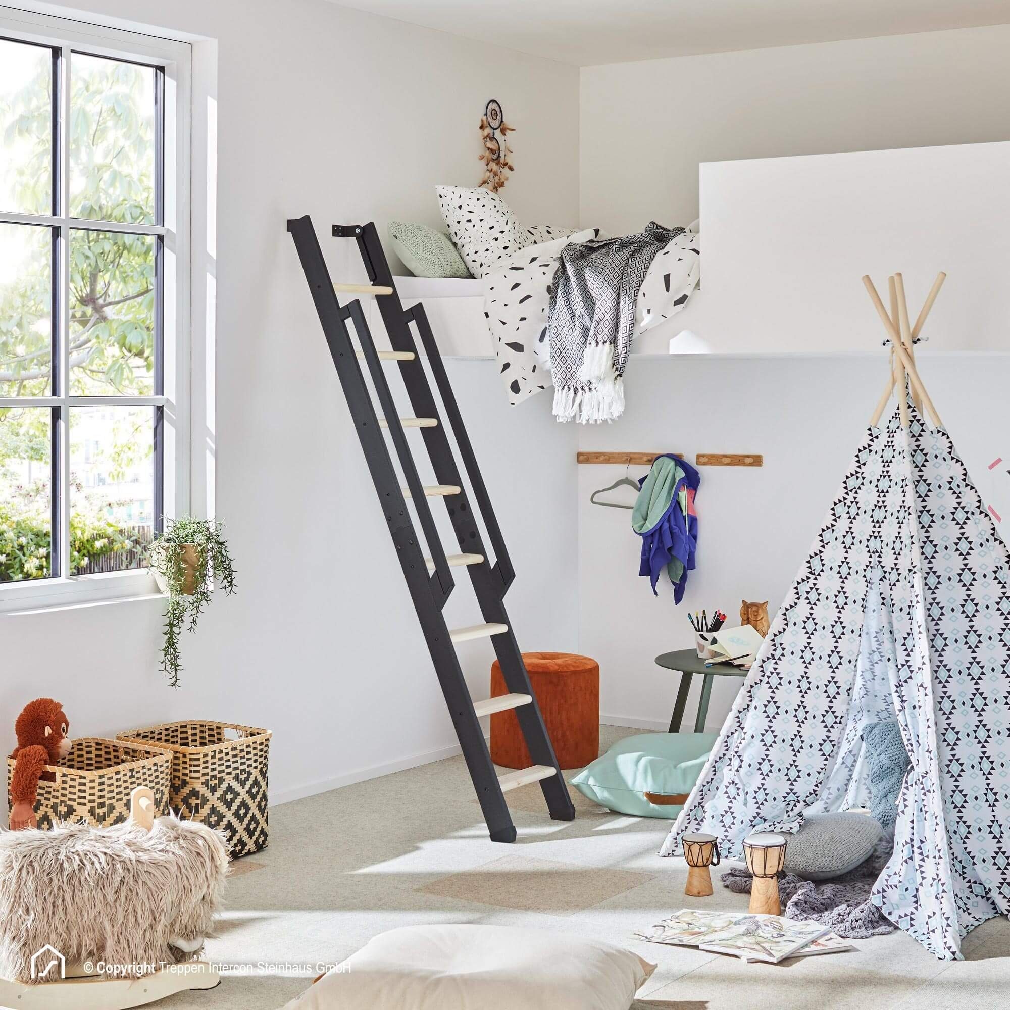 Die 8-stufige Hochbettleiter ist mit einer maximalen Höhe bis 199 cm bestens für Hochbetten bzw. Stockbetten ausgelegt. Впередe Вариантыn erreichen Geschosshöhen von 243 cm (10 Stufen) sowie 290 cm (12 Stufen). Mit der neuen 6-stufigen Варианты für Höhen bis 152 cm ist die Raumspartreppe nun auch für kleinere Hochbetten geeignet. Der beidseitige Handlauf bietet festen Halt und sorgt für einen sicheren Auf- und Abstieg. .