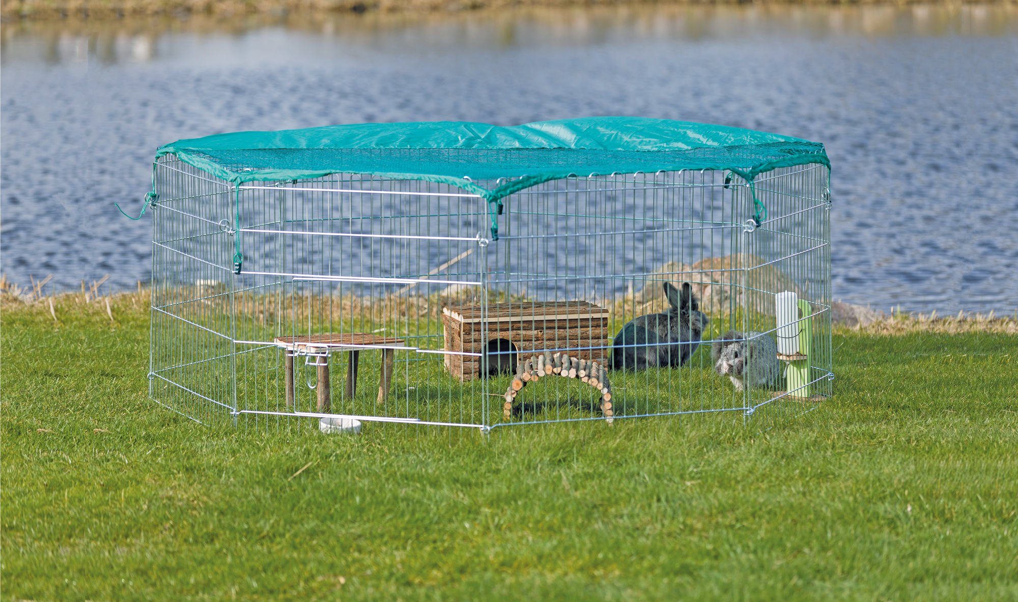 Durch die integrierte Tür können Sie Ihre Tiere einfach in das Gehege einsetzen, das mitgelieferte Schutznetz verhindert ein Herausspringen der Tiere und schützt gleichzeitig vor Greifvögeln und Katzen. Das Netz mit einer Maschenweite von ca. 1 x 1 cm ist zur Hälfte aus geschlossenem Material und dient so zusätzlich als Sonnenschutz an heißen Tagen.