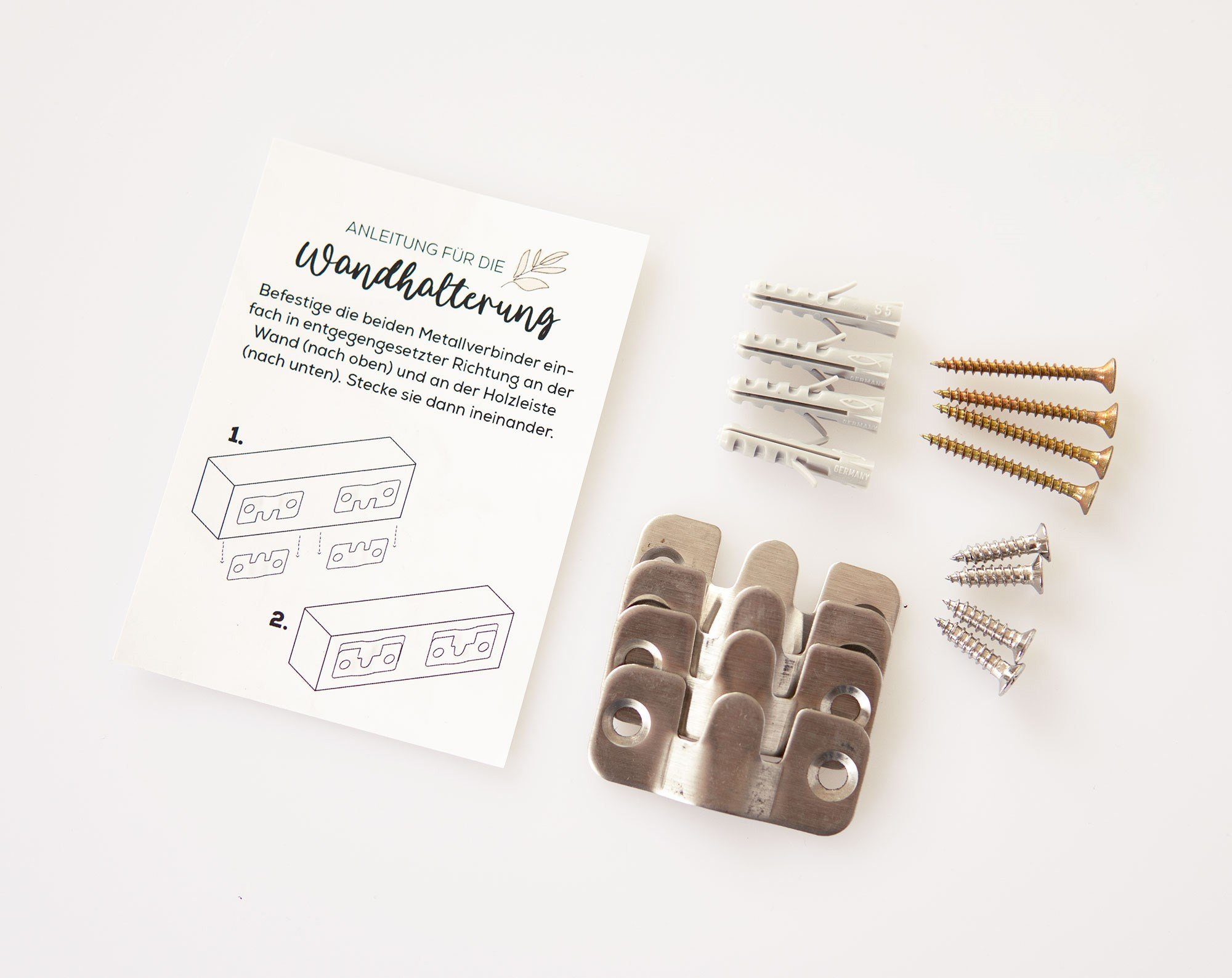 Lieferumfang | 4 Dübel für die Wand, 4 lange Schrauben für die Wand, 1 Kurzanleitung auf ENGLISCH & DEUTSCH, 4 kurze Schrauben für das Holz, 4 Metallverbinder |