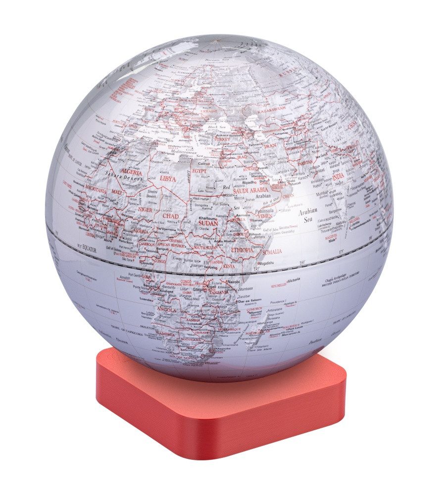 Globus mit 30 cm Durchmesser, magnetischer, grauer Standfuß aus recyceltem Material, 3D Druck, Kunststoff, matt, grau/schwarz/silberfarben.