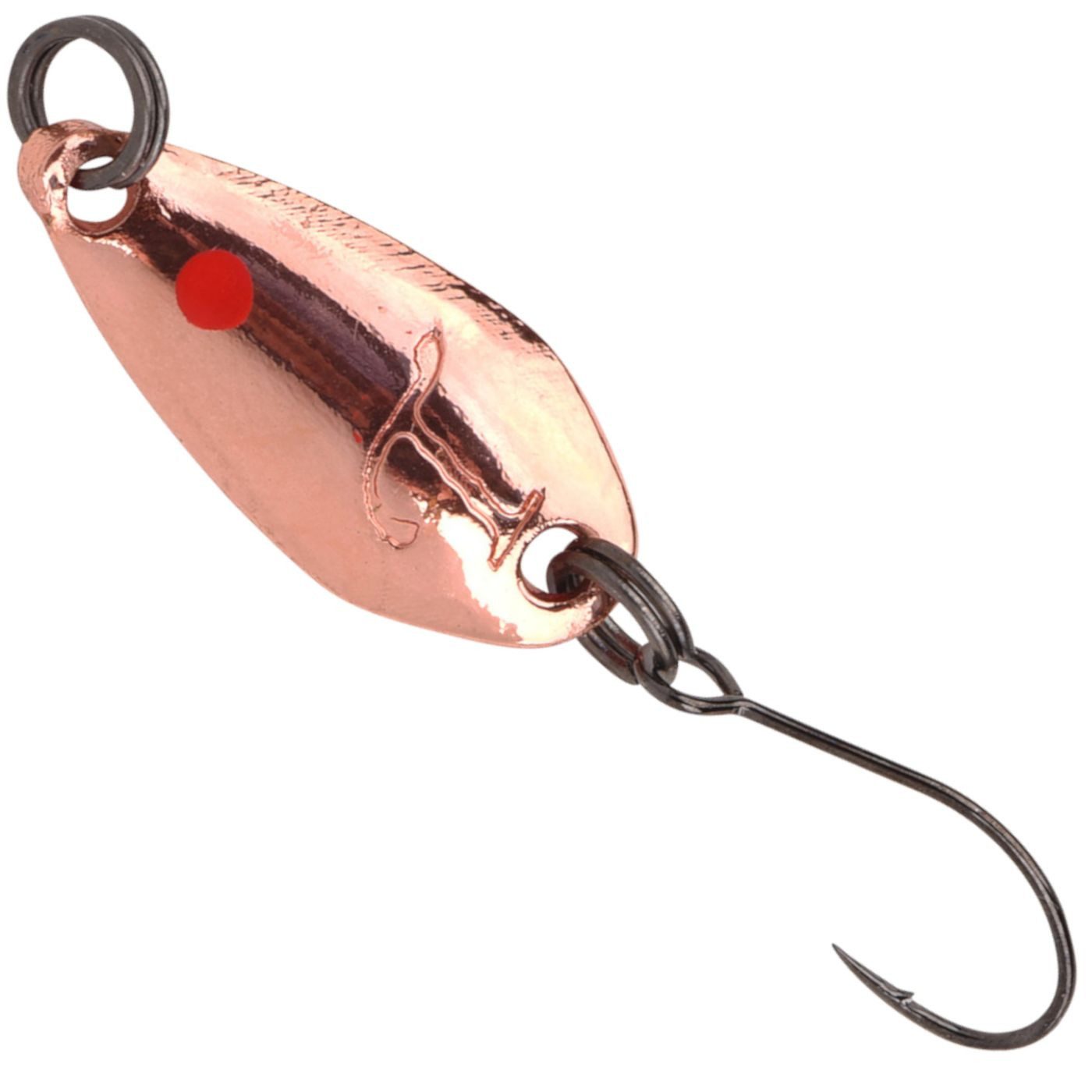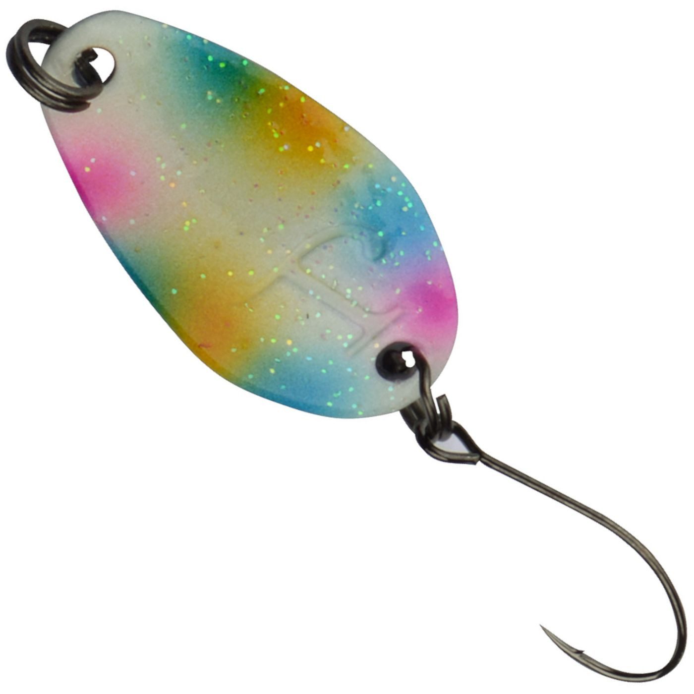 Trout Master Incy Spoon - Forellenblinker - Die Kunstköder von Trout Master weisen eine Длина von 2cm auf und bringen gerade einmal 0,5g auf die Waage. Trotz der geringen Größe besitzt der Forellenblinker einen sehr lebhaften sowie verführerischen Köderlauf und durch die kompakte Bauweise lassen sich zudem mit leichtem Forellentackle große Wurfweiten erzielen. Das leichte Gewicht ermöglicht eine langsame Köderpräsentation, so dass verschiedene Gewässerbereiche ausgiebig abgefischt werden können. Ausgestattet ist der Forellenköder mit einem sehr scharfen Einzelhaken, der wiederum an einem starken Sprengring montiert ist. Die Forellenblinker lassen sich sehr gut zum Spinnfischen am Forellenteich und Forellensee einsetzen, aber auch beim Spinnangeln auf Bachforellen in Bächen stellen die Blinker einen tollen Köder dar.