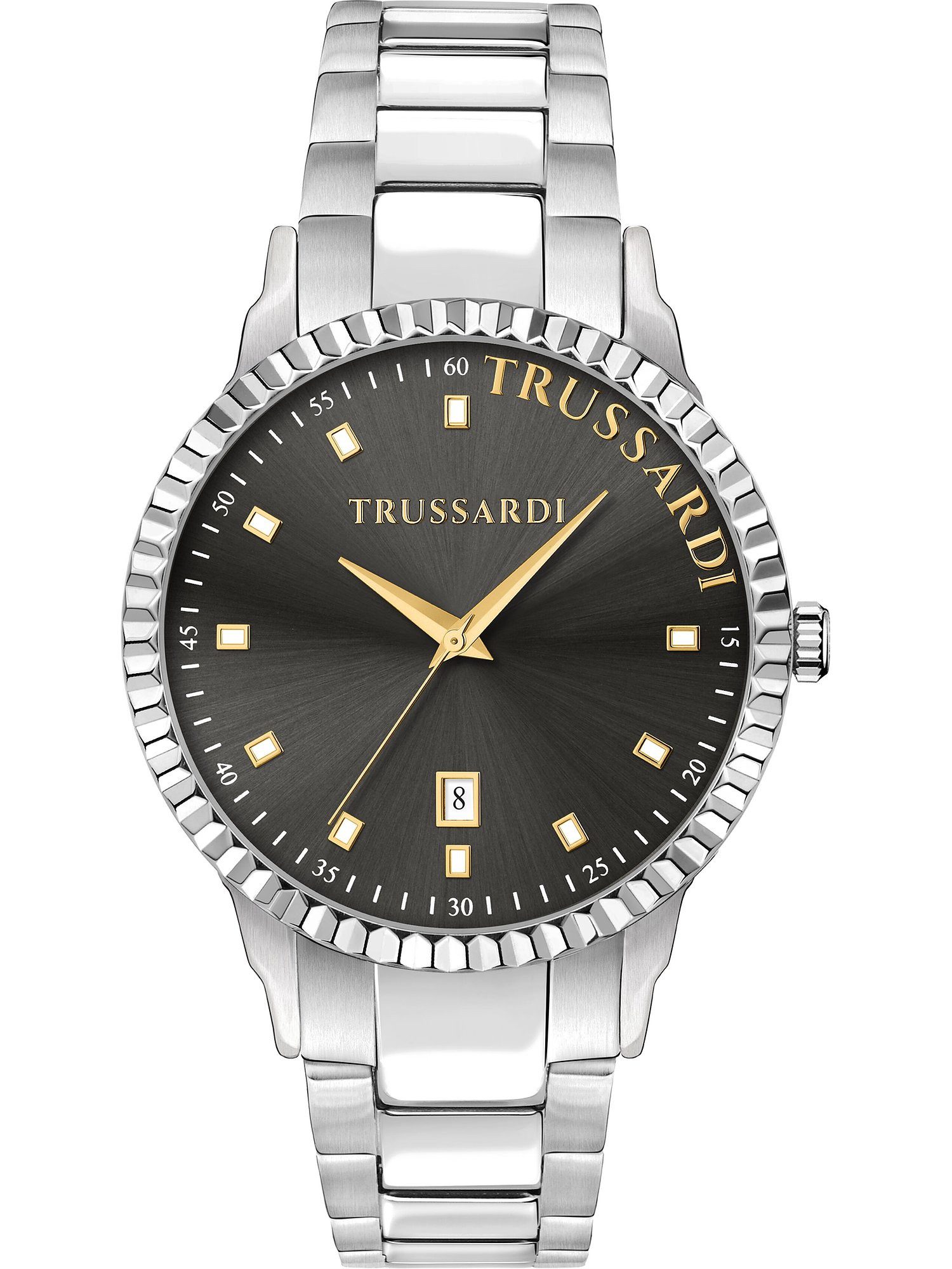 Trussardi Uhren stehen für italienische Eleganz in ihrer schönsten Form. Mit zeitlosen Designs und hochwertigen Materialien verleihen diese Zeitmesser jedem Look einen Hauch von Luxus. Perfekt für alle, die Stil und Klasse schätzen. Eine perfekte Kombination aus lässig und elegant – das ist diese Herrenuhr. Sie wird besonders durch das Edelstahl-Gehäuse und das unkomplizierte Armband aus Edelstahl geprägt. Die T-Bent von Trussardi kommt in Silber daher, wozu das graue Ziffernblatt besonders gut aussieht. Passt an schmale Handgelenke ebenso gut wie an breitere: Das runde Gehäuse mit 43 mm Durchmesser ist ein echter Allrounder. Ein Quarzwerk der Marke Miyota sorgt für die nötige Genauigkeit. Durch die Markierungen fällt die Orientierung auf dem Ziffernblatt leicht, so dass die Zeit gut ablesbar ist. Die T-Bent ist nicht nur ein echter Blickfang, sondern auch äußerst praktisch: Neben der Uhrzeit wird auch das Datum angezeigt. Das verwendete Mineralglas bietet eine gute Sicht und ist widerstandsfähig gegen alle Einflüsse, die bei normalem Gebrauch entstehen. Mit einer Wasserdichte von bis zu 50 Metern (5 Bar) ist dieser Zeitmesser ein verlässlicher Begleiter, da er sowohl beim Händewaschen als auch beim Baden getragen werden kann. Durch die Faltschließe lässt sich das Armband leicht anlegen und sicher verschließen. Kurz gesagt: Die Trussardi T-Bent Herrenuhr ist ein Statement für guten Geschmack - und ein zuverlässiger Begleiter im Alltag.