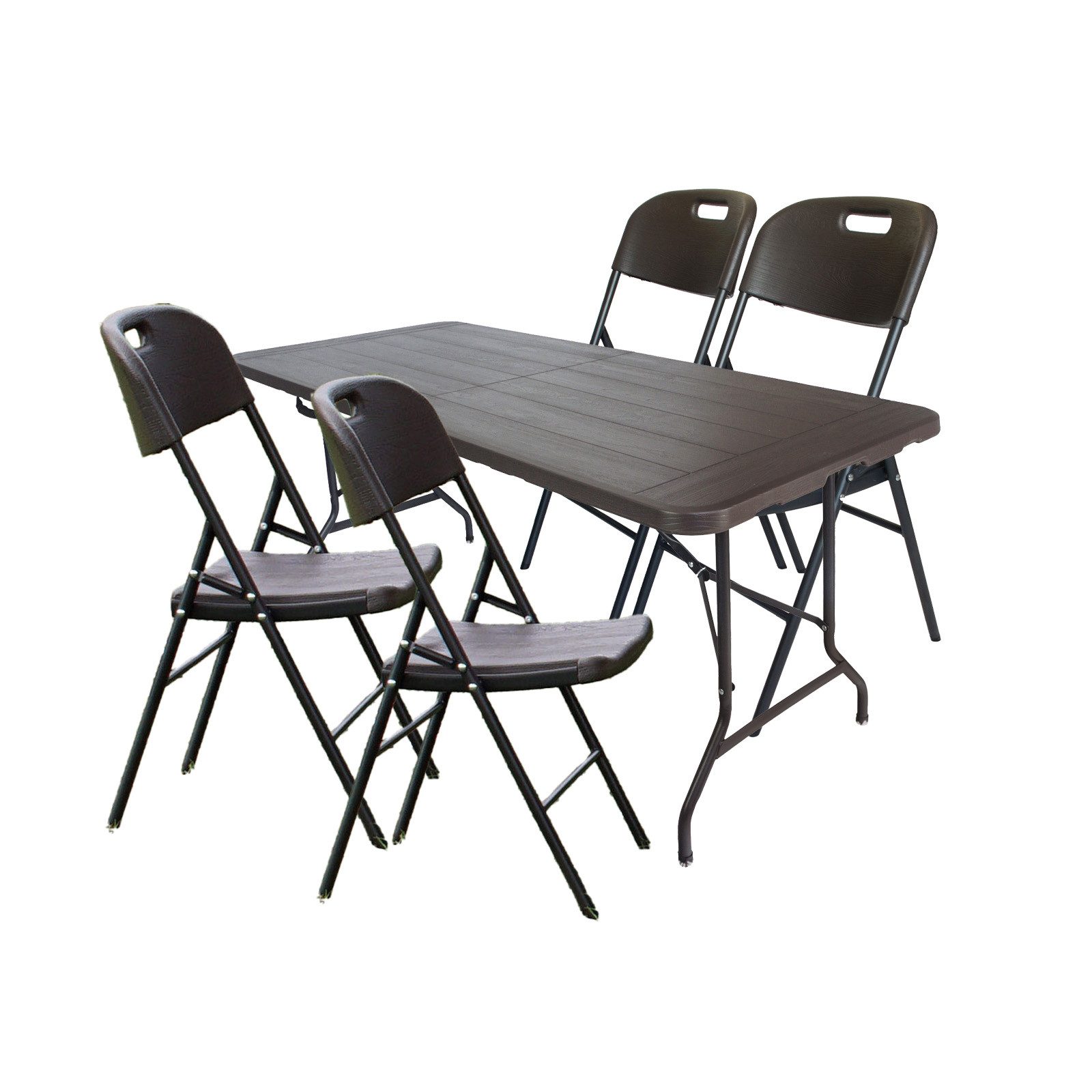 Tisch und Stühle sind zusammenklappar und lassen sich mit den integrierten Tragegriffen leicht und handlich transportieren.