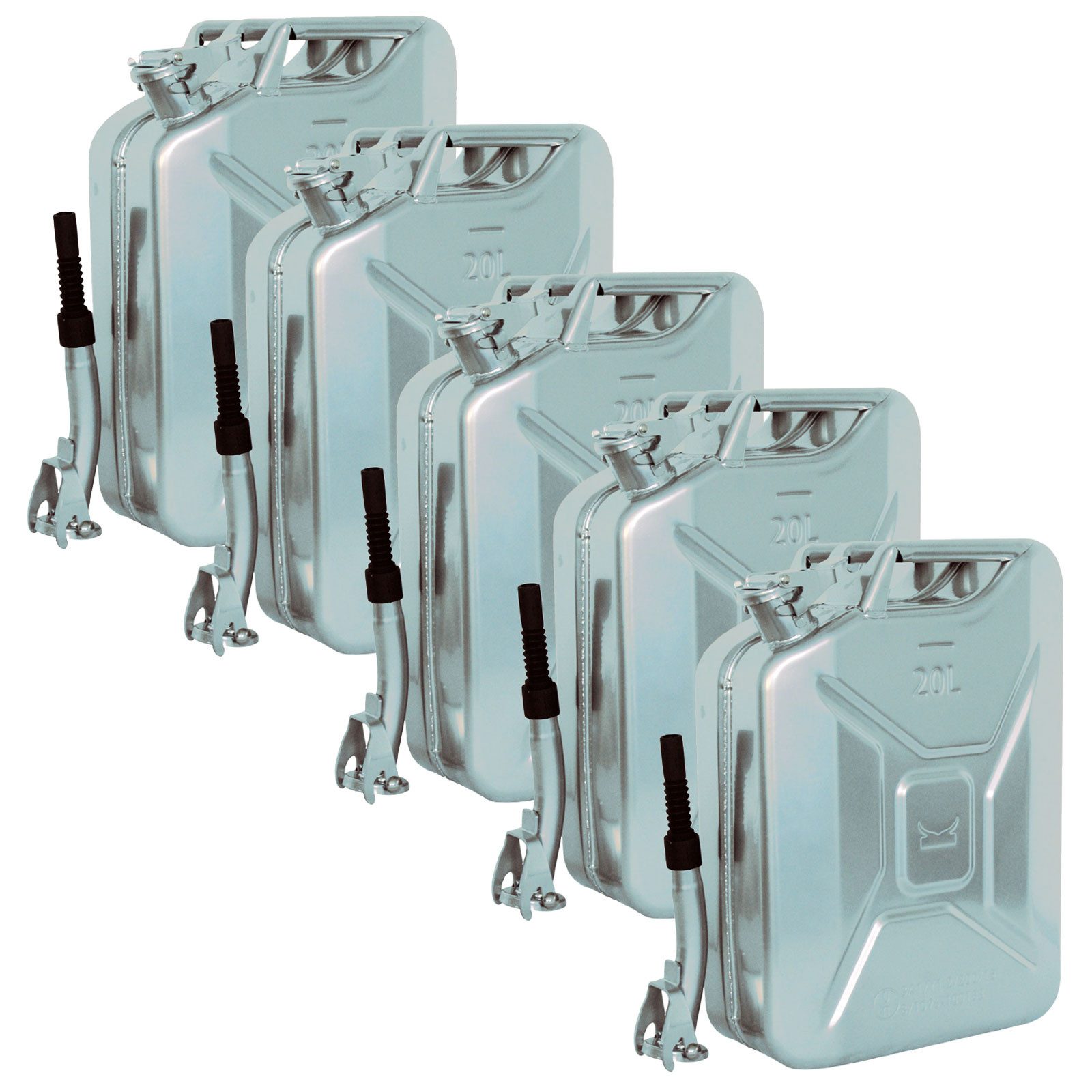 Lieferumfang | 5x Metallkanister 20l silber 5x Ausgießer flexibel silber 5x Halter für Ausgießer |