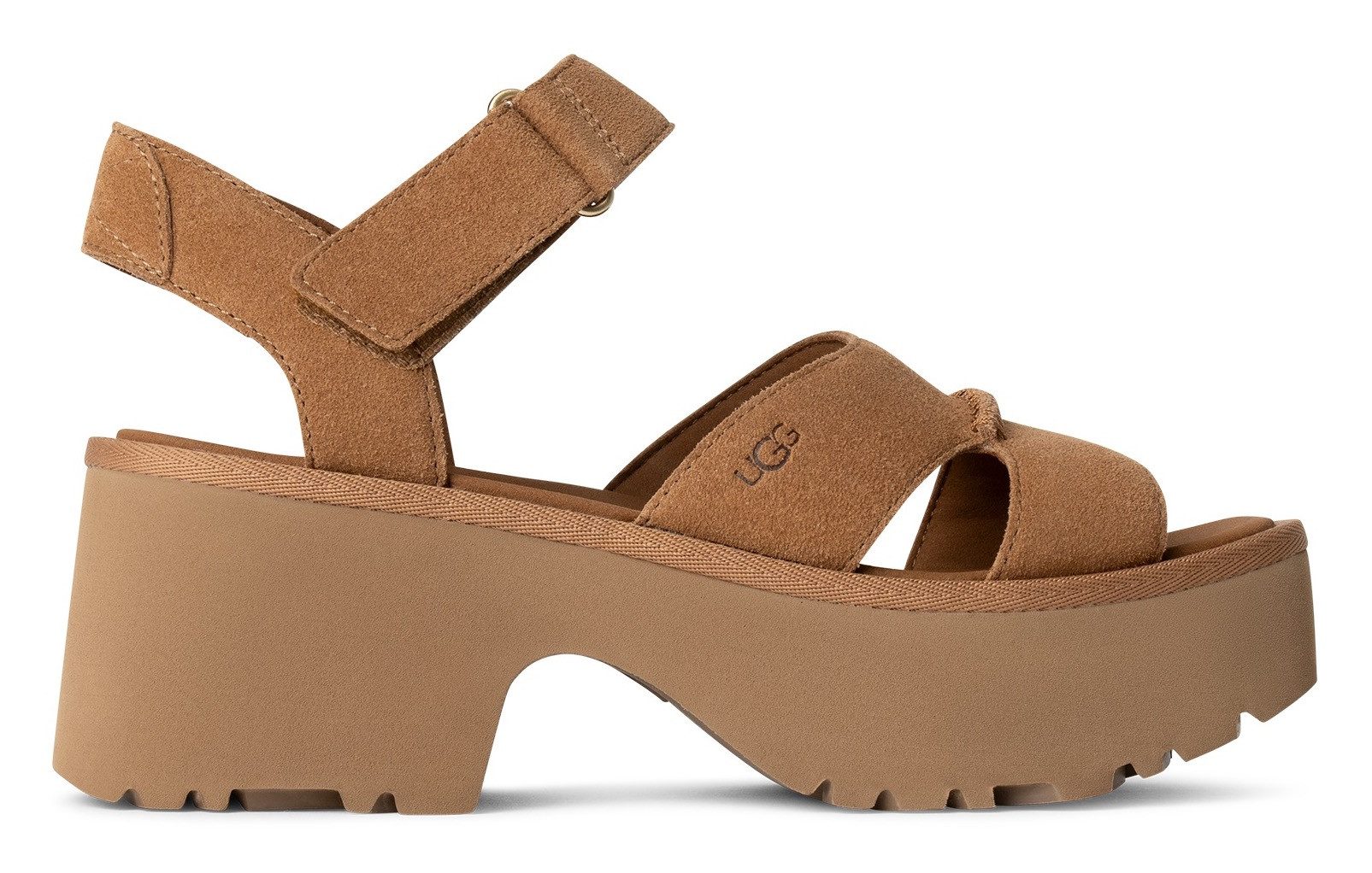 Die Plateausandaletten von UGG passen gut zu deinem Urlaubs-Outfit. Damit kannst du stilvoll und bequem die warmen Sommerabende genießen. Mit dem Klettverschluss lässt sich der Schuh schnell an- und ausziehen sowie in der Weite individuell anpassen.