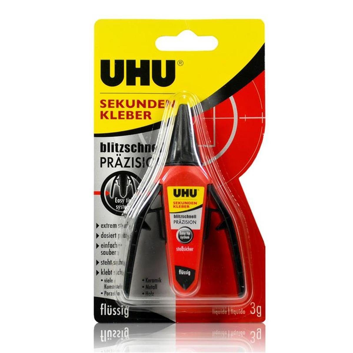 Der UHU Sekundenkleber flüssig - so gelingt Ihnen die AnwendungDer UHU Sekundenkleber flüssig härtet blitzschnell aus und ist echt stark. Das Produkt fließt in kleinste Ecken und Spalten, sodass Sie für eine beinahe unsichtbare Verbindung sorgen können. Die feine Dosierspitze ermöglicht Ihnen ein punktgenaues Dosieren. Der UHU Sekundenkleber flüssig ist wasserfest und eignet sich daher selbst für das Reparieren von Tassen oder anderen Gegenständen, die mit Wasser in Verbindung kommen. Die Klebeverbindung des UHU Sekundenklebers flüssig ist lange haltbar und sorgt so für eine einfache Reparatur von gebrochenen Gegenständen.