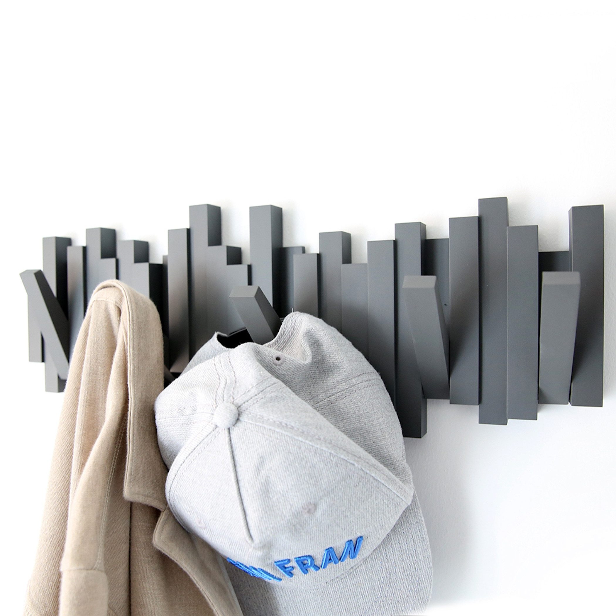 Die Umbra Sticks Garderobenhaken bieten eine optimale Kombination aus Funktionalität und zeitgemäßem Design. Diese modische Wandgarderobe zeichnet sich durch ihr skulpturales Aussehen aus und passt sich mühelos in jeden Wohnraum ein. Sie ist aus hochwertigem, geformtem Holz in einem stilvollen Anthrazitton gefertigt und verleiht Ihrem Zuhause eine Prise Eleganz.