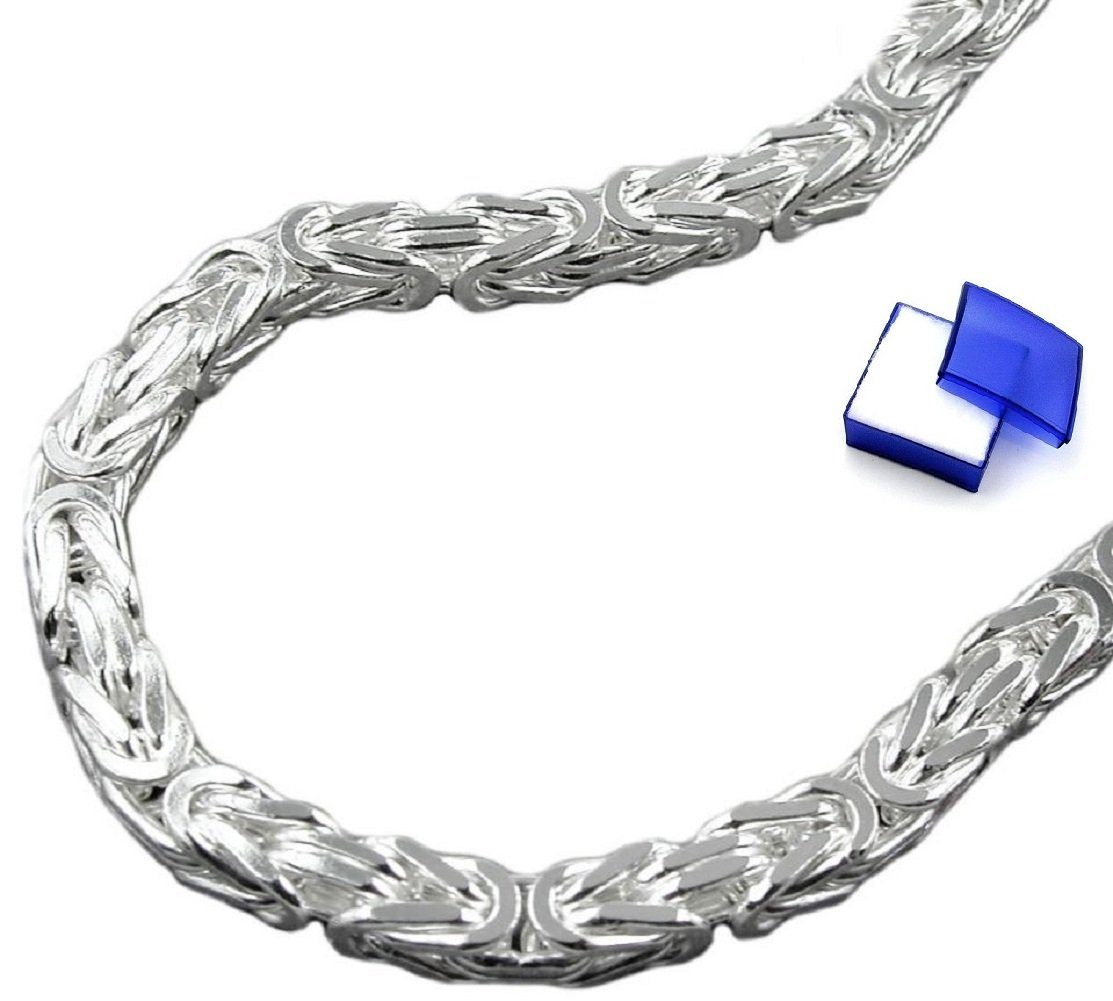Was für ein majestätischer Anblick! Die Königskette gehört zu den prachtvollen Schmuckketten. In einem aufwendigen Herstellungsprozess wird massiver Runddraht in Silber 925 verbogen und verflochten und anschließend durch Walzen in eine quadratische Form gepresst. Dieses stabile Silberarmband zählt mit 5mm Kantenlänge zu den stärkeren Königsketten und prangt prunkvoll am Handgelenk. Ein Armband umschmeichelt das Handgelenk und ist zur Freude des Trägers immer in seinem Blickbereich. Ein exklusives Geschenk für echte Männer und erfolgsverwöhnte Herren!