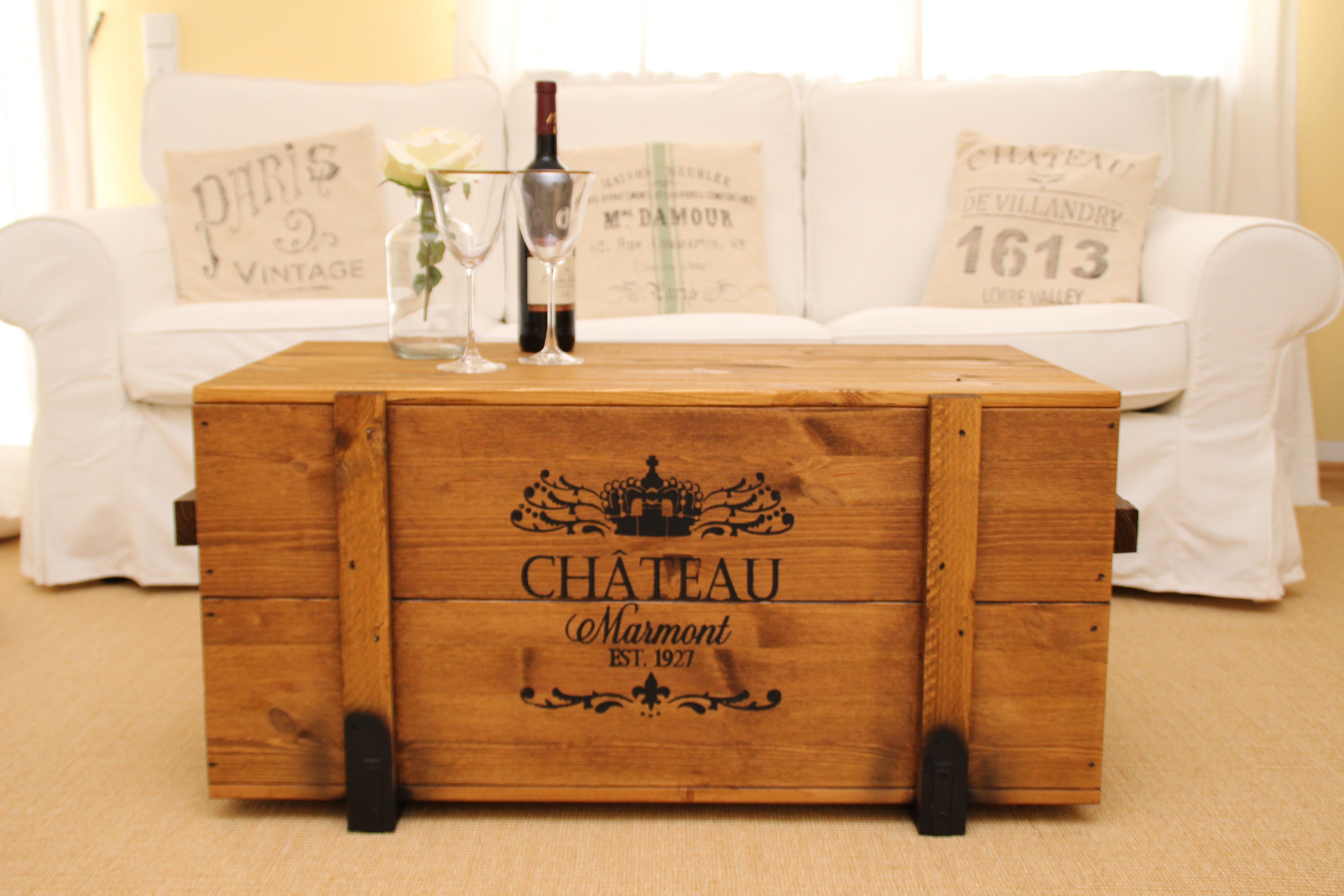 Diese Chateau-Truhe von Uncle Joes reiht sich ideal als Couchtisch oder Sitzbank in Ihr Interieur im modischen Shabby-Chic ein. Sie besteht aus hochwertigem, massiven Kiefernholz und wurde handgefertigt. Dabei unterstreichen der aufwendige Chateau-Druck, sowie die geschwärzten Akzente die Retro-Optik und verleihen dem Möbelstück eine rustikale Note. Das Innere bietet dabei großzügigen Stauraum. Das Highlight für Ihr Wohnzimmer im besonderen Look! Der stabile Couchtisch von Uncle Joes im Vintage Design ist ein echter Blickfang. Neben der kreativen Optik besticht die handgefertigte Truhe durch ihre Funktionalität: Der abnehmbare Deckel ist nicht befestigt, wodurch die Truhe leicht geöffnet werden kann. Der Tisch hat außerdem einen großen Stauraum in dem allerlei Dinge ihren Platz finden. Dadurch können Sie den Tisch auch als Truhe nutzen. Durch die qualitativ hochwertige Verarbeitung bietet der Couchtisch eine Tragkraft von bis zu 100 kg. Der Truhentisch wird fertig montiert geliefert. Dieses außergewöhnlich schöne Stück wird aus Massivholz in Handarbeit hergestellt. Wir fertigen ausschließlich in Deutschland aus heimischen Hölzern und tragen damit dem Gedanken der Эко-товары umfassend Rechnung. Wir verwenden ausschließlich Farben auf Wasserbasis und verzichten damit auf jegliche Lösemittel.