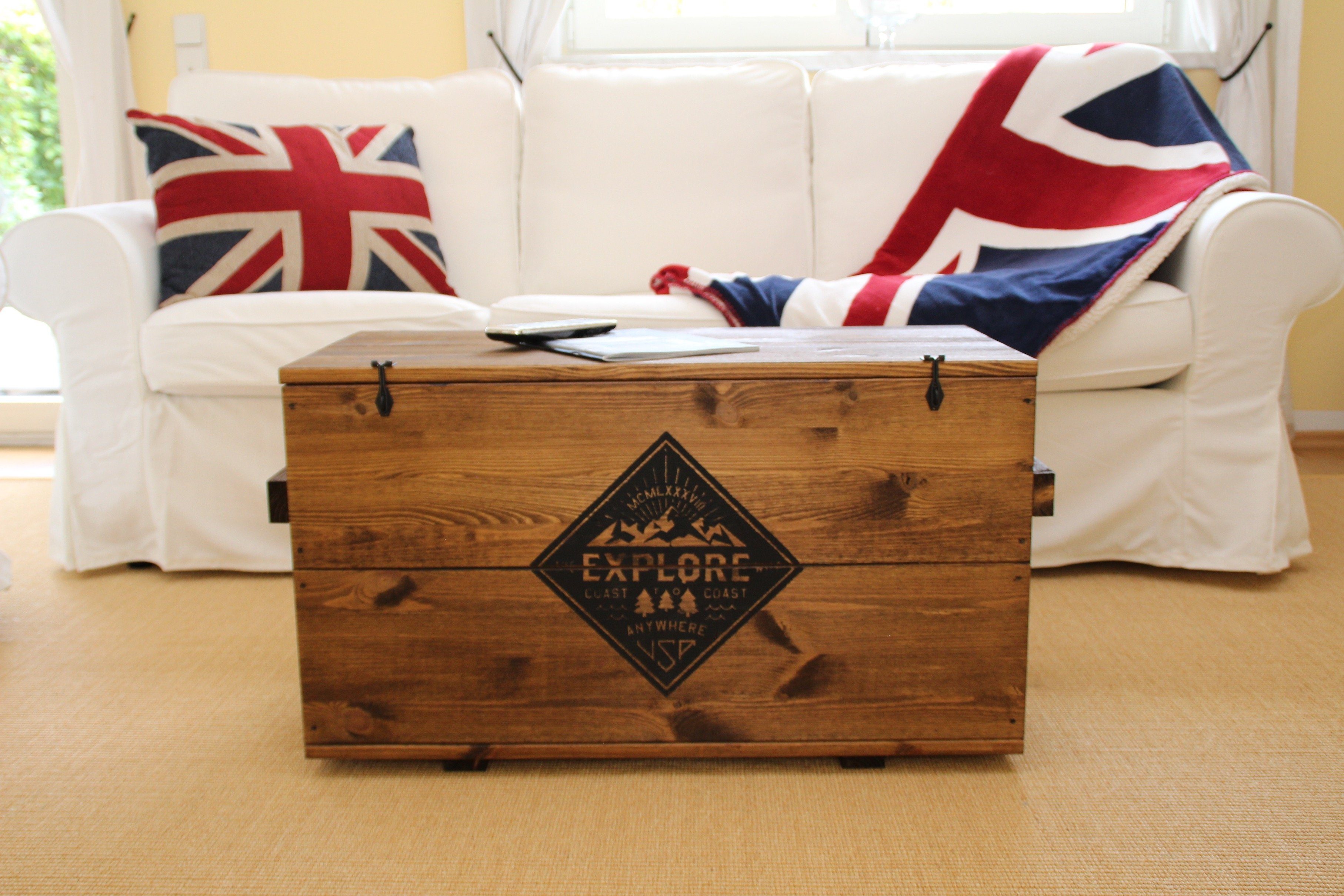 Der stabile Couchtisch von Uncle Joes® im Vintage-Design ist ein echter Blickfang. Neben der kreativen Optik besticht die handgefertigte Truhe durch ihre Funktionalität. Der aufklappbare Deckel ist mit Scharnieren befestigt, wodurch die Truhe leicht geöffnet werden kann. Der Tisch hat einen großen Stauraum in dem allerlei Dinge ihren Platz finden. Dadurch können Sie den Tisch auch als Truhe nutzen. Durch die qualitativ hochwertige Verarbeitung bietet der Couchtisch eine Tragkraft von bis zu 100 kg. Der Truhentisch wird fertig montiert geliefert.
