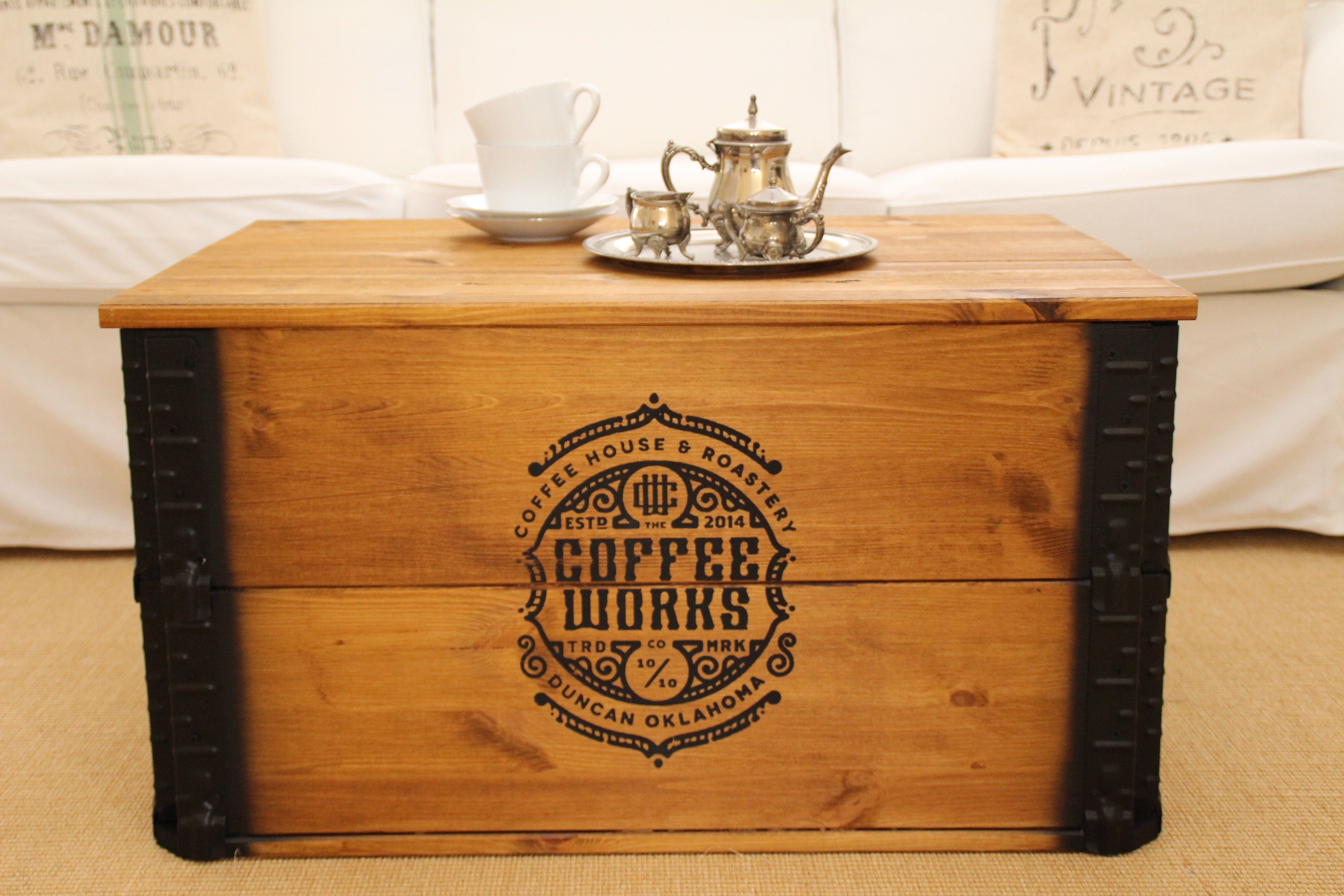 Das Highlight für Ihr Wohnzimmer im besonderen Look! Der stabile Couchtisch von Uncle Joe´s im Vintage-Design ist ein echter Blickfang. Neben der kreativen Optik besticht die handgefertigte Truhe durch ihre Funktionalität. Der aufklappbare Deckel ist mit Scharnieren befestigt, wodurch er leicht geöffnet werden kann. Der Tisch hat einen großen Stauraum, in dem allerlei Dinge ihren Platz finden. Dadurch können Sie den Tisch auch als Truhe nutzen. Durch die qualitativ hochwertige Verarbeitung bietet der Couchtisch eine Tragkraft von bis zu 100 kg. Der Truhentisch wird fertig montiert geliefert. Es muss nur noch der Deckel mit den mitgelieferten Schrauben an den markierten Stellen befestigt werden. Die Abmessungen der Truhe sind (BxTxH) 80 x 55 x 44 cm und das Massivholz Kiefer ist ca. 20 mm stark. Dieses außergewöhnlich schöne Stück wird aus Massivholz in Handarbeit hergestellt. Wir fertigen ausschließlich in Deutschland aus heimischen Hölzern und tragen damit dem Gedanken der Эко-товары umfassend Rechnung. Wir verwenden ausschließlich Farben auf Wasserbasis und verzichten damit auf jegliche Lösemittel.