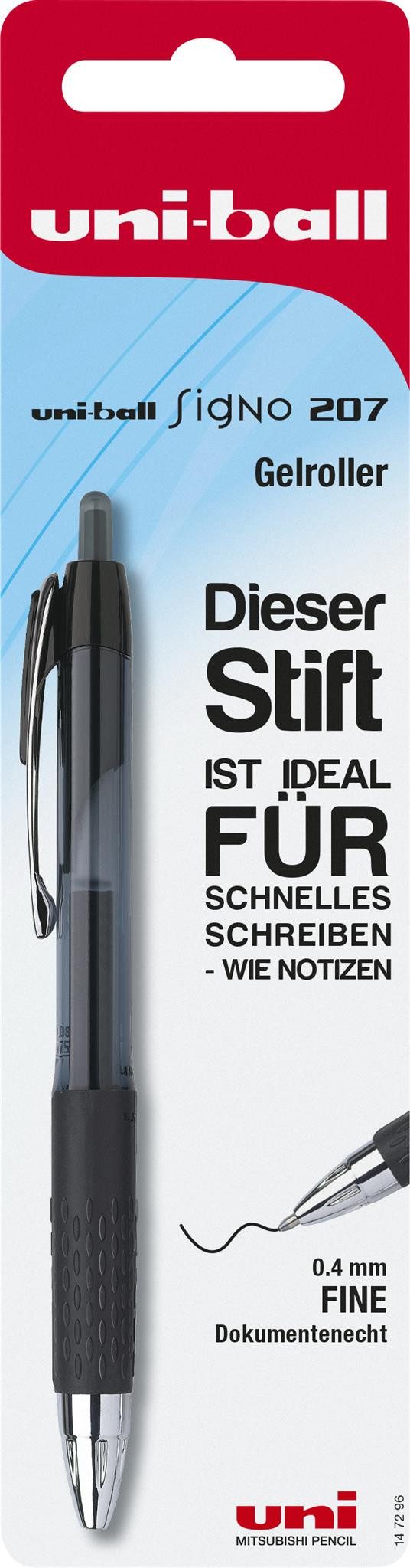 Gelroller UB SIGNO 207 0,4mm schwarz BK. Geeignet für Schecks, etc. Ideal zur Einhandbedienung. Zum Durchschreiben geeignet.. Ausführung Schreibflüssigkeit und Speichersystem: Tinte, Schreibfarbe von Schreibgeräten: schwarz, dokumentenecht, kann einige Tage offen liegen bleiben ohne einzutrocknen.Technik des Tintenspeichers: Free Ink System. Ausführung Mine: Typbezeichnung der Mine: Spezialmine 1472.., Ausführung der Spitze: Rollerspitze, Strichstärke: 0,3. Mine auswechselbar. Ausführung Stift: Material des Clips: Kunststoff, Ausführung der Griffzone: Gummigriffzone, Farbe des Schaftes: transparent. Material des Schaftes: Kunststoff, Ausführung der Vorschubmechanik: Druckmechanik. Ausführung des Inhalts mit Packung: 1 Stück auf Blisterkarte