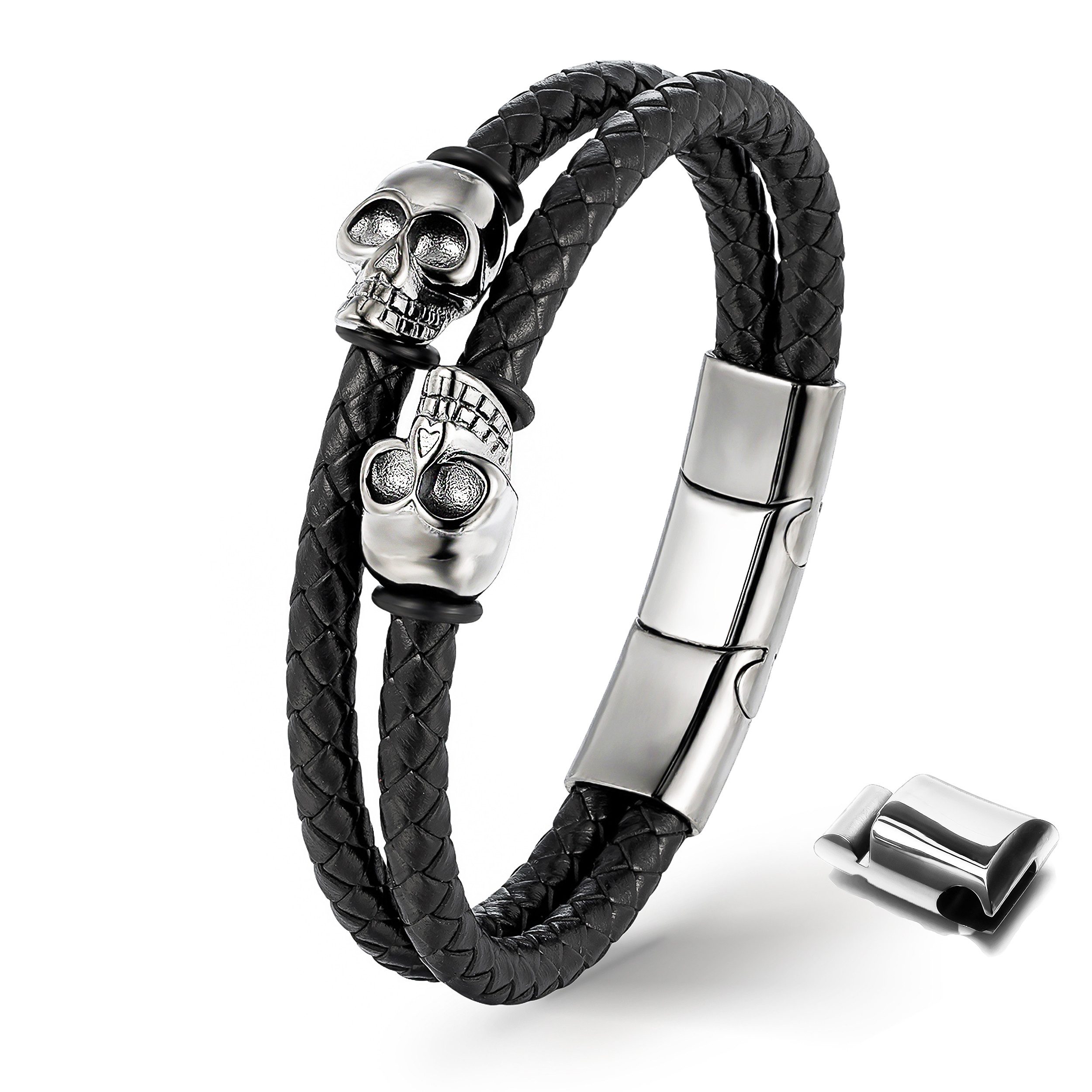Entdecken Sie das exklusive schwarze geflochtene Lederarmband mit Edelstahlelementen, einem Totenkopf in der Mitte und einem praktischen Magnetverschluss. Dieses Unisex-Armband vereint robuste Eleganz mit persönlicher Note und ist ideal für jeden Anlass geeignet.