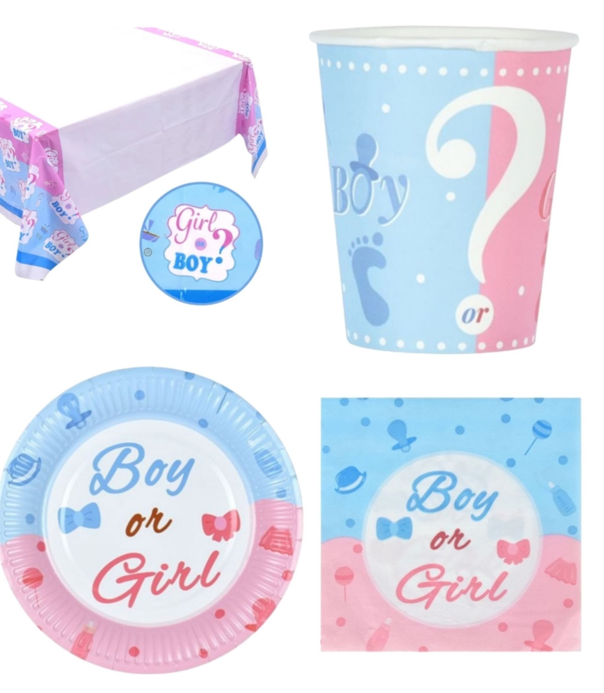 Komplettes Dekoset für Baby Shower im "Boy or Girl"-Thema.