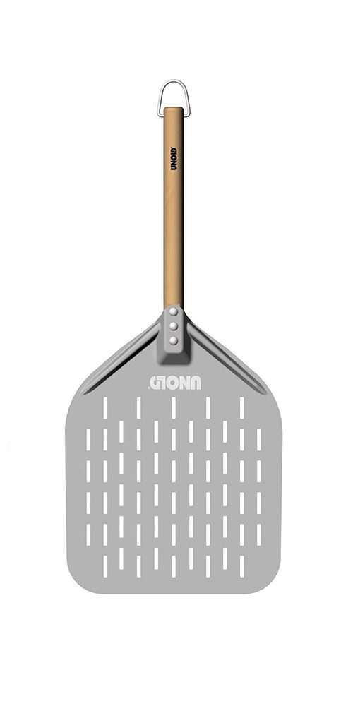 Perforierung der Schaufel - Dampf der fertigen Pizza entweicht schneller und überschüssiges Mehl fällt hindurch.