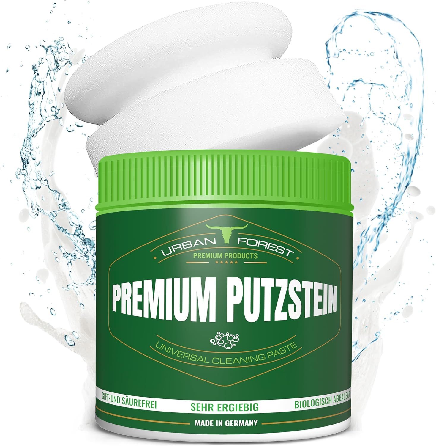 Gründliche Reinigung und Politur mit dem PREMIUM PUTZSTEIN VON URBAN FOREST Dieser Universal Reiniger ist der ideale Helfer für alle Lebenslagen und geeignet für nahezu alle abwischbare Materialien und Untergründe. Entwickelt und produziert mit rein biologischen Inhaltsstoffen zur Reinigung und komplett ohne chemische Zusätze ist der lebensmittelechte Reiniger bestens geeignet für Großbetriebe wie Hotels, Gaststätten, Krankenhäuser und Servicebetriebe. Dabei ist er Gift- und säurefrei und völlig ungefährlich für Kinder und Umwelt! Dieser Allzweck-Reiniger kann nahezu überall eingesetzt werden. Egal ob zur Küchenreinigung, zur Badreinigung, als WC-Reiniger oder rund um das Haus. Dabei ist die Reinigungspaste kalklösend, super ergiebig und unbegrenzt haltbar. Verkrustungen im Backofen, werden ebenso einfach beseitigt wie z.B. Wasserflecken, Fettflecken, Ölflecken, Flugrost, Bremsstaub, Insektenrückstände, Teerflecken, Ruß, Algen & Moos, Make-Up, Nikotin, Vergilbung, verschmutzte Fliesenfugen u.v.m. Anwendungsbeispiele für Materialien: - Chrom Nickel (Edelstahl) - Silber - Gold - Zinn - Kupfer - Messing - Acryl - Emaille - Aluminium - lackiertes Holz - Kunstleder - Kunststoffe - Keramik - Marmor - Porzellan - Granit - Glas u.v.m. Anwendungsbeispiele für Haushalt: - Waschbecken - Ceranfelder - Fensterläden - Kunststofffenster - Heizkörper - Induktionsherde - Herdplatten - Armaturen - Badewannen - Fliesen - Spiegel - Schuhe - Taschen - Musikinstrumente - Dritte Zähne - Kaminscheiben - Schmuck - Gartenmöbeln u.v.m. Anwendungsbeispiele für Freizeit: - Boote - Surfbretter - Autos - Wohnwagen - Motorräder - Fahrräder - Solarien - Steigbügel - Trense -Stahlfelgen - Tennisschuhe u.v.m. Nicht geeignet für weiche, lackierte oder empfindliche Oberflächen wie Acrylglas, Aluminium u. Autolack Ein Putzstein für überall: Wirksame Hilfe gegen eingetrocknete Fettflecken, Kalkflecken oder Essensreste schnelle, einfache Reinigung besonders hautschonend, nicht hautreizend sehr hygienisch In der Küche beschränkt sich die Verwendung des PREMIUM PUTZSTEIN von URBAN FOREST nicht nur auf die Oberfläche der Arbeitsplatte und der Schrankwände, sondern er eignet sich auch zur Reinigung von Spülbecken. Mit dem Premium Putzstein lassen sich Fett und eingebrannte Speisereste leicht von Backblechen, Induktionsplatten, Töpfen und Pfannen entfernen. Dabei hinterlässt er einen schmutzabweisenden Film, der die gereinigte Oberfläche länger sauber hält und einen angenehmen Citrusduft. Bad putzen: Schnell und einfach in kurzer Zeit das Bad auf Vordermann bringen PREMIUM PUTZSTEIN von URBAN FOREST reinigt, poliert und pflegt in einem Arbeitsgang Sie wollen Ihr Bad richtig putzen, damit endlich wieder alles glänzt? Der PREMIUM PUTZSTEIN von URBAN FOREST als ein leistungsstarkes Reinigungsmittel und ein effektiver Kalkentferner, basiert auf reinigungsaktiven Substanzen und mikrofeinen Polierkörpern natürlichen Ursprungs, reinigt mühelos die Duschkabinen, die Badewanne, die Fliesen, die Toilette, die Spiegel und die Armaturen im Badezimmer. Der Premium-Abperleffekt macht die gereinigten Flächen wasser- sowie auch schmutzabweisend und unterstützt damit die lang anhaltende Sauberkeit. Einfach anfeuchten, reiben und den Schmutz lösen. Der PREMIUM PUTZSTEIN von URBAN FOREST besteht aus unbedenklichen Inhaltsstoffen , die sich in der Natur schnell zersetzen. (Etikett & Abbildung können ggf. abweichen)