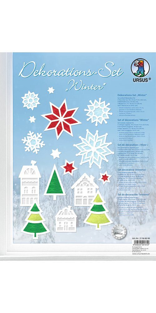 Bastelset Fensterbilder 'Winterzeit' mit Material für 3 Häuschen ca. 10,0 x 13,0 cm bis 11,5 x 22,5 cm, 4 Eiskristalle ca. 10,0 cm bis 20,5 cm, 3 Tannenbäume ca. 11,0 x 18,0 cm bis 15,0 x 20,0 cm und 7 Sterne ca. 3,8 bis 21,0 cm. Eine Bastelanleitung ist ebenfalls enthalten. Mit den fertigen Fensterbildern können Fenster, Türen oder Geschenkverpackungen wundervoll zur Weihnachts- und Winterzeit verziert werden. Ein Bastelspaß für die ganze Familie.
