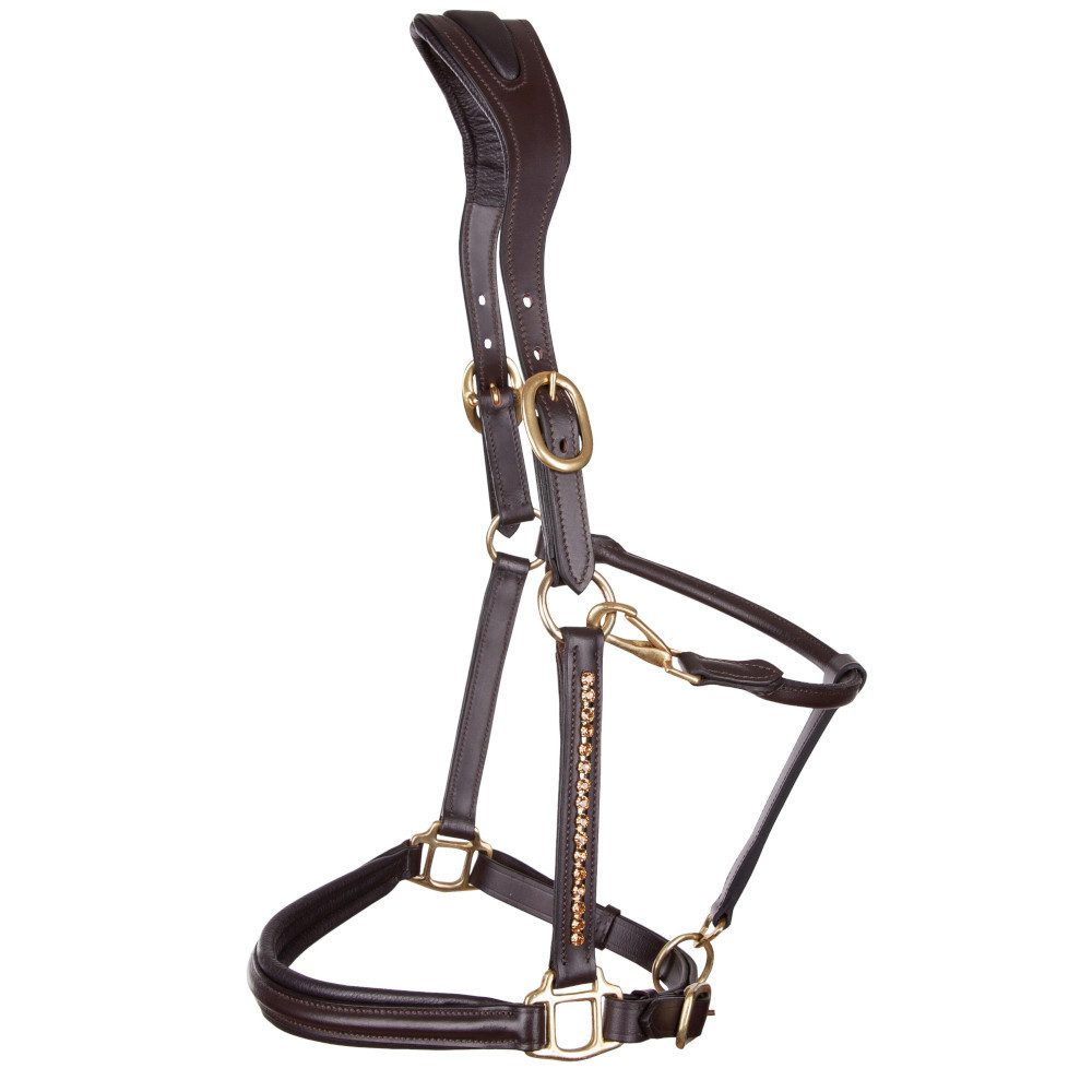 Das USG Lederhalfter "Lovely" besticht mit einem edlen und hochwertigen Leder. Um einen hohen Tragekomfort zu gewährleisten ist es im Nasen- und Genickbereich angenehm weich unterlegt. Zudem ist das Genickstück beidseitig verstellbar und anatomisch geformt, um die empfindlichen Nerven im Ohrenbereich auszusparen. Hochwertige Schnallen und Karabinerhaken am Kehlriemen runden das Ganze ab. Das Highlight des Designs sind jedoch die Glitzerapplikationen an den Backenstücken, welche im Sonnenlicht leicht funkeln.